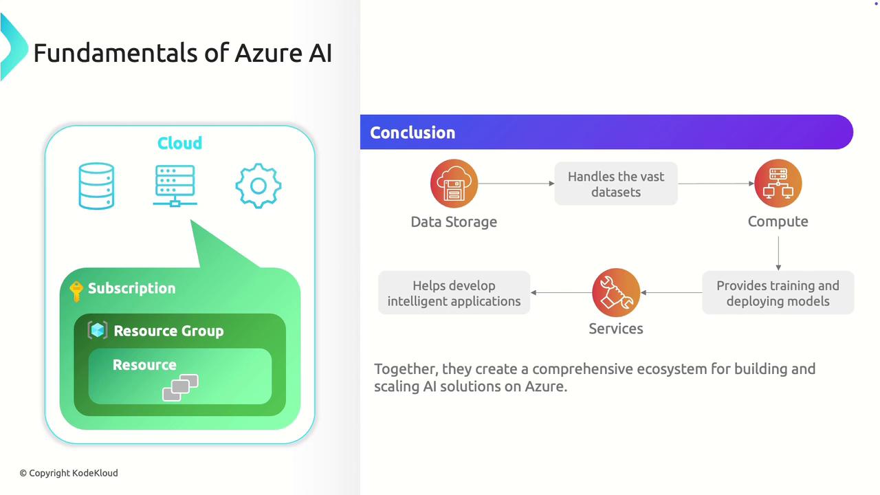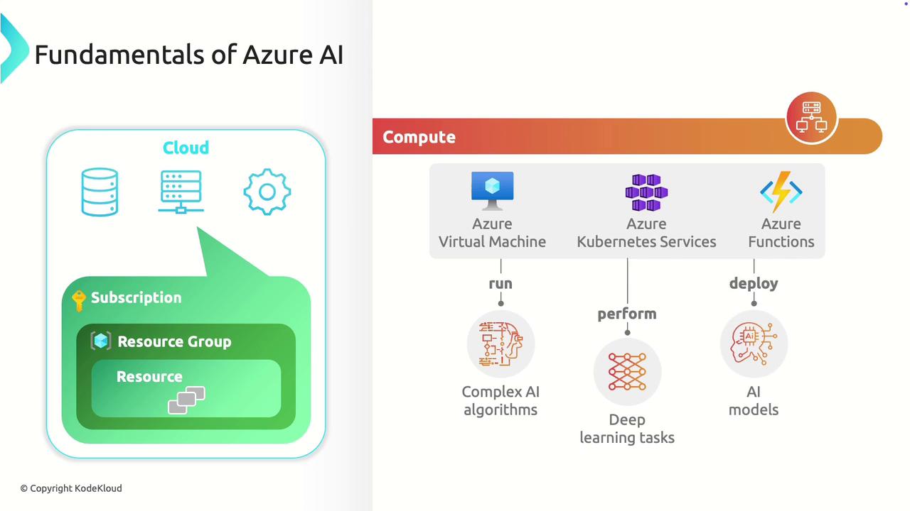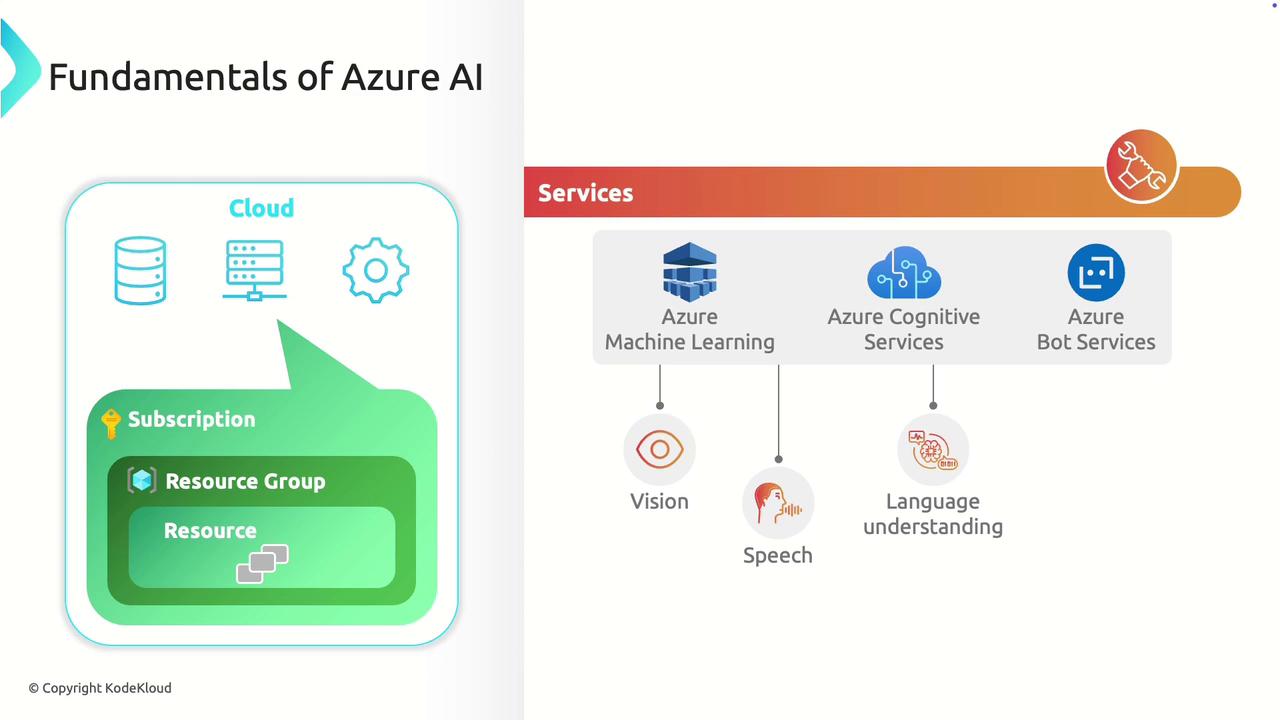 Azure AI is built on a structured cloud infrastructure that enables efficient management and scalability of your AI projects. At the highest level, a subscription represents your account and the gateway to all Azure resources. Within each subscription, resource groups act as containers that organize related items—including storage, compute, and services—required for your AI applications.