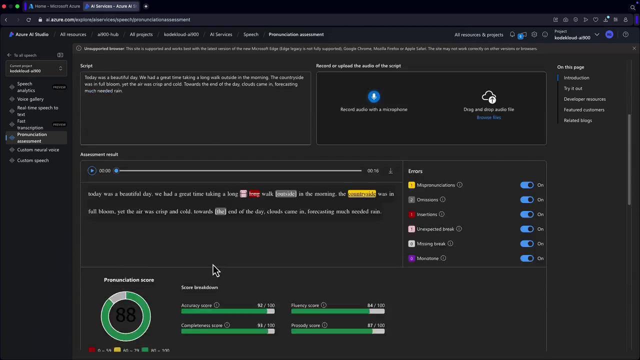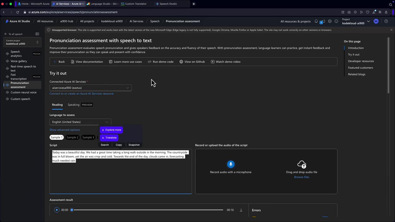Pronunciation Assessment: Evaluate your speech by comparing it against a provided script. This tool provides scores and error analysis to help improve pronunciation.