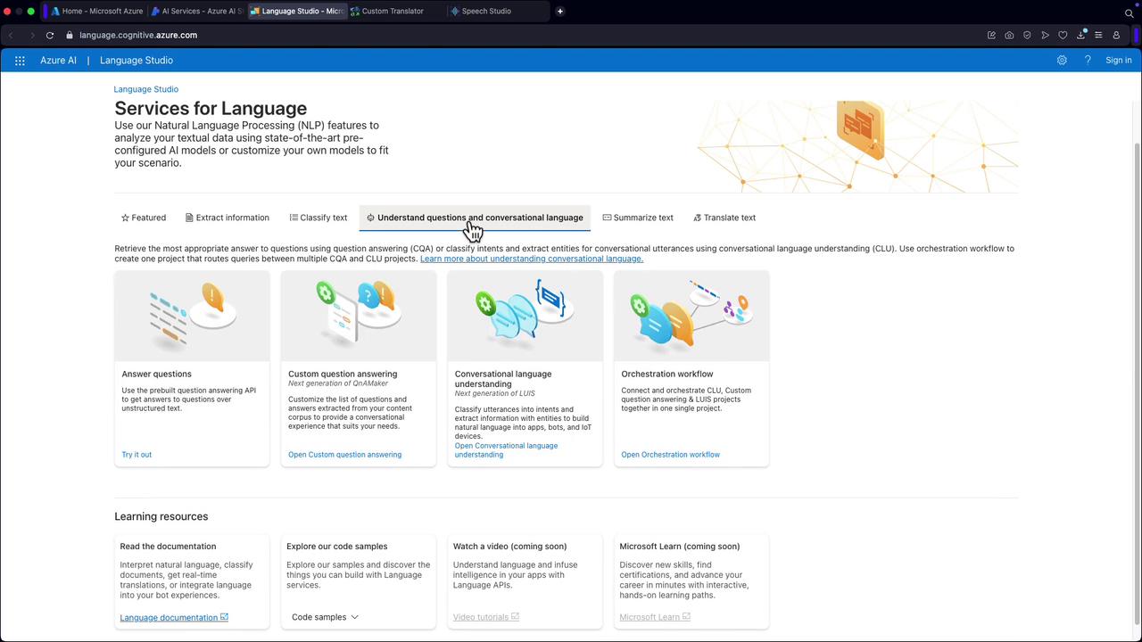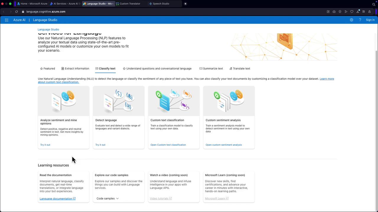 Additionally, the Language Studio supports various NLP services such as sentiment analysis, text classification, and conversational language understanding: