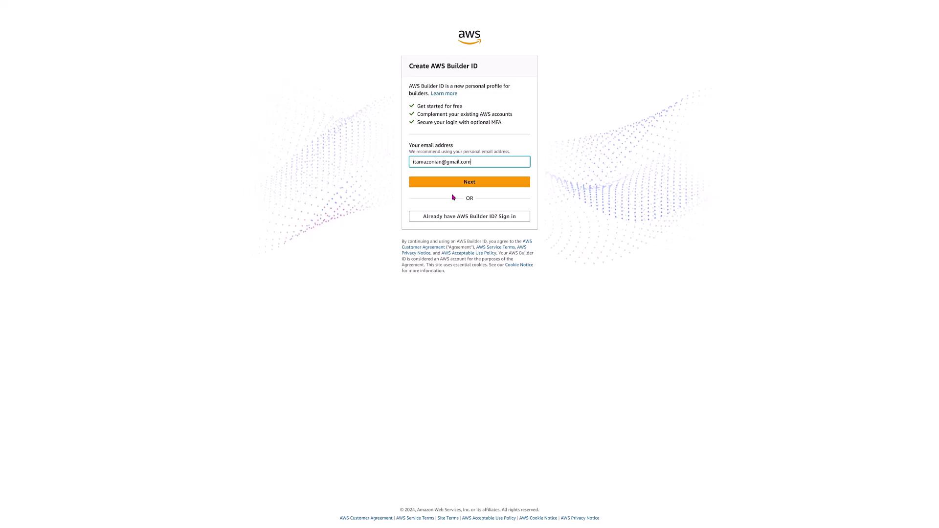Sign in using your AWS Builder ID. If you’re not affiliated with an AWS partner organization, select AWS Builder ID and then click on “create or sign in.” For this demo, we are using the AWS Builder ID associated with a personal email.