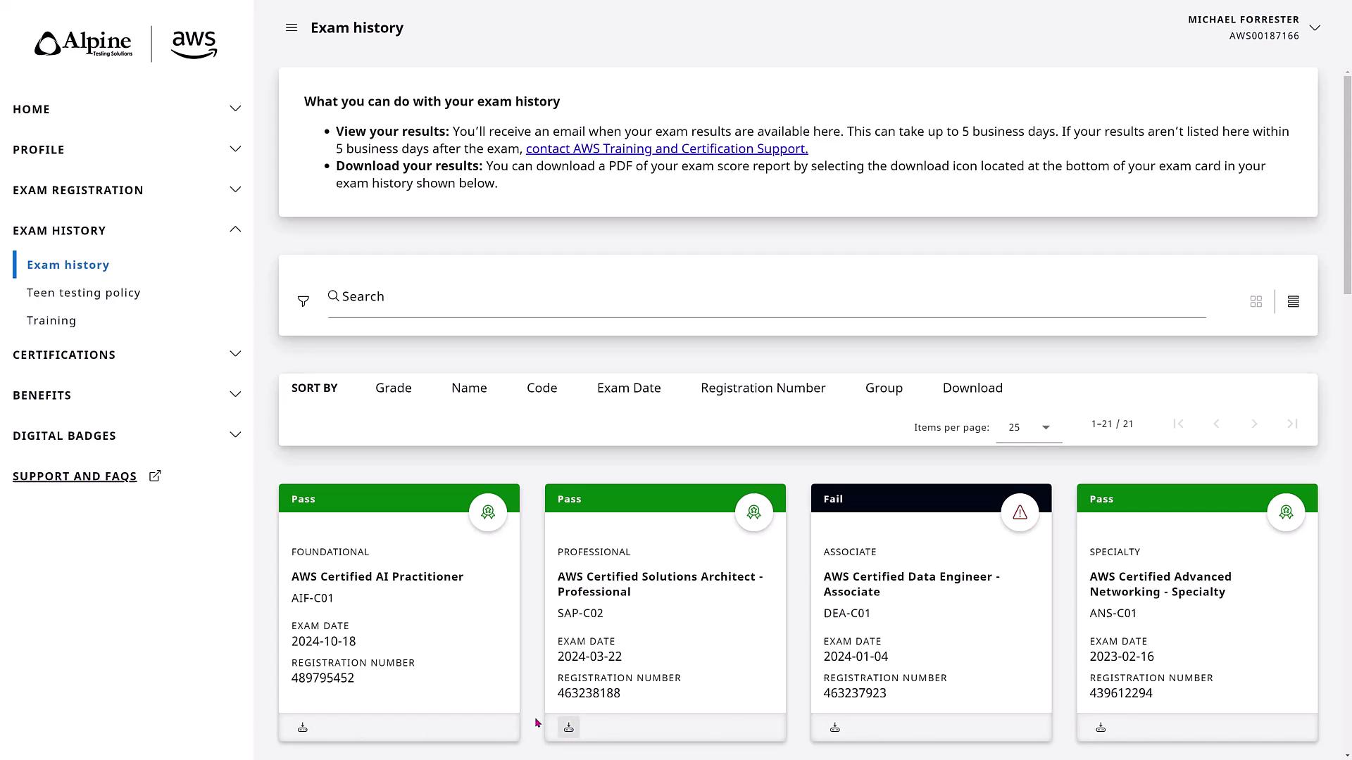 The exam history section displays detailed exam results, including notes on challenging exams and instances when retakes were necessary. On exam day, the scheduling page will update to show only the exams you are registered for, with options to view, reschedule, or cancel your appointment.