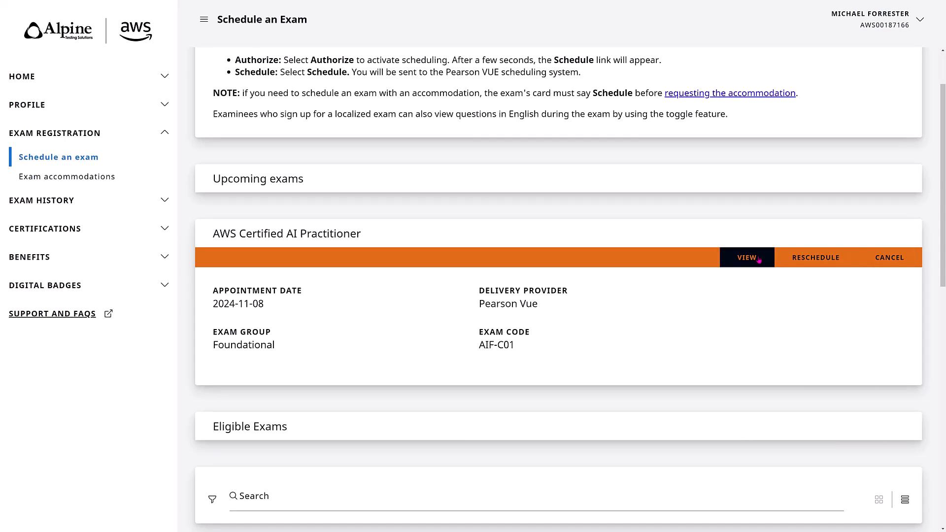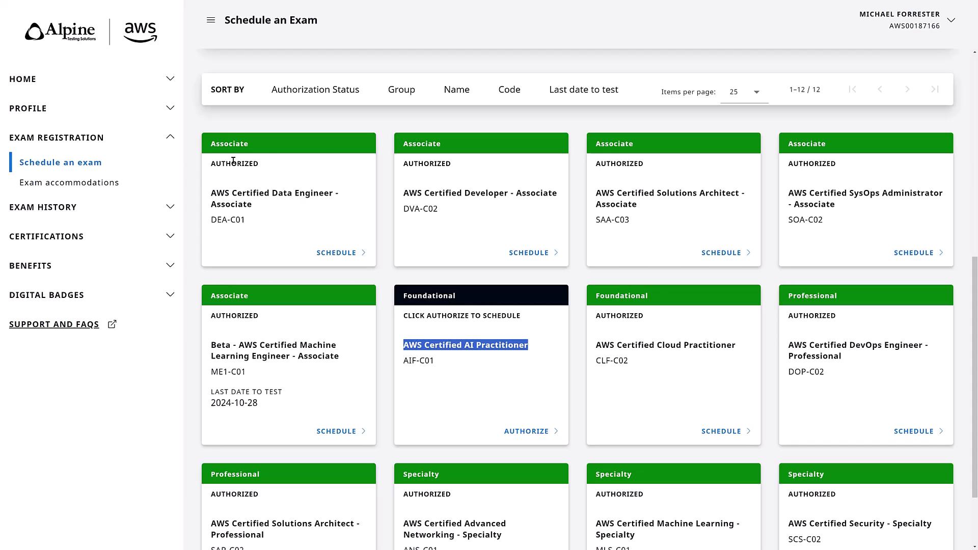 To register for a new exam, click on “Schedule an Exam.” Scroll down to locate the AWS Certified AI Practitioner exam. Note that the exam might appear in black instead of green, which indicates that authorization may be required.