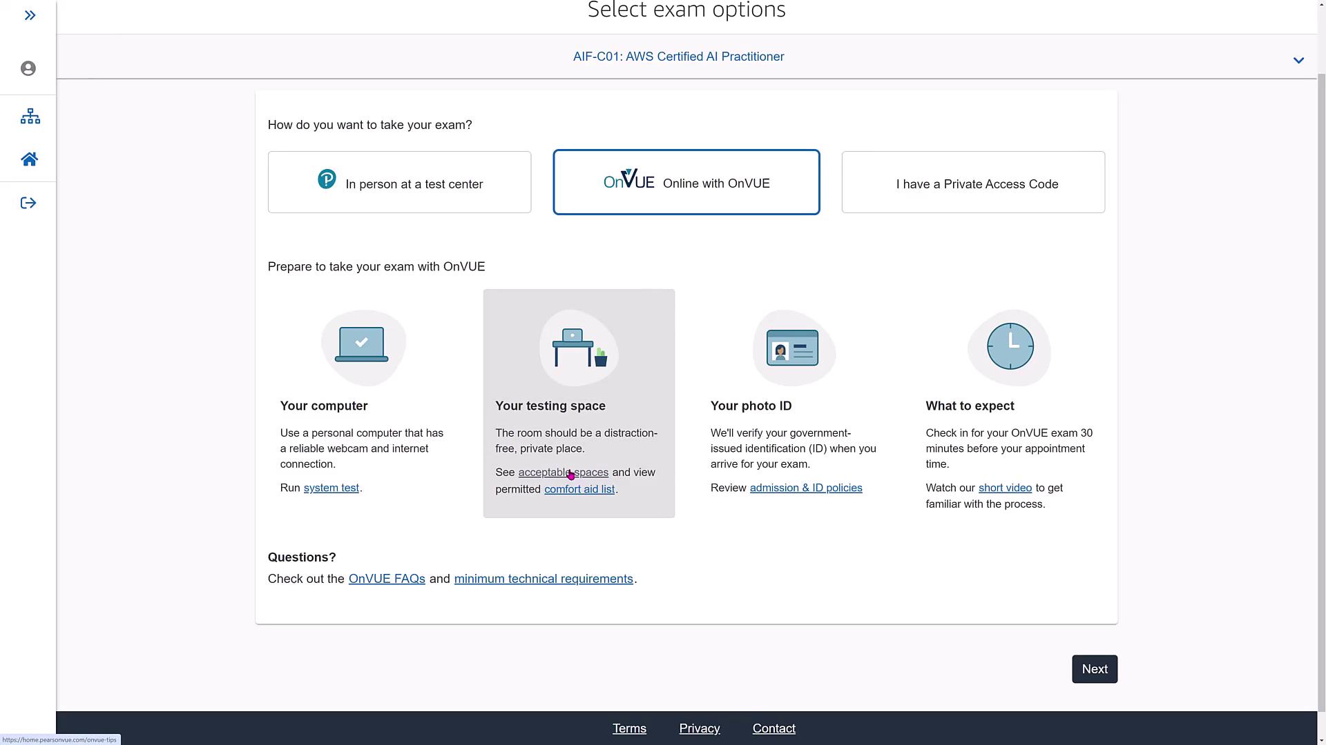 After running your system test, continue with the exam registration. AWS offers an option to register using a Private Access Code if one is provided. The exam is available in five written languages.