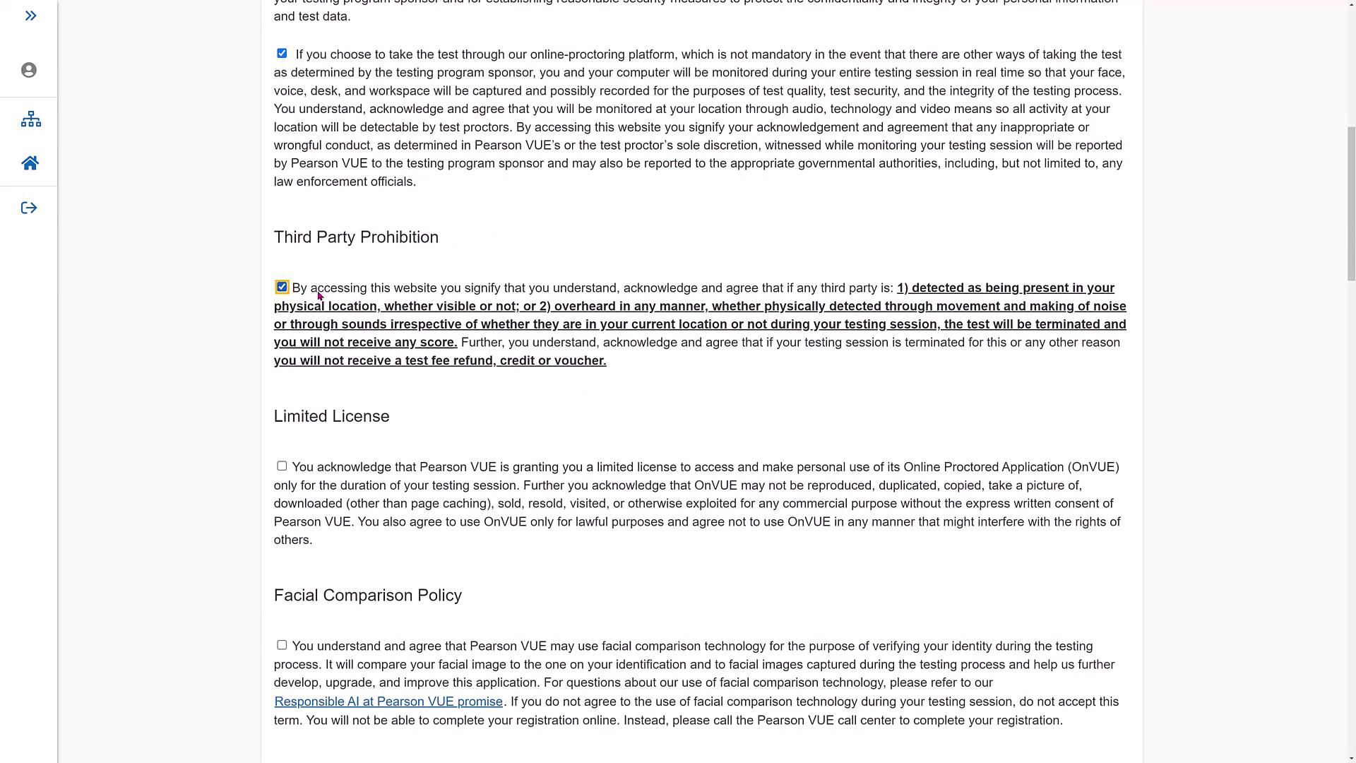Review the detailed exam policies, including data processing rules, prohibition of third-party assistance, and proctoring regulations. These guidelines also cover facial comparison requirements and testing space restrictions.