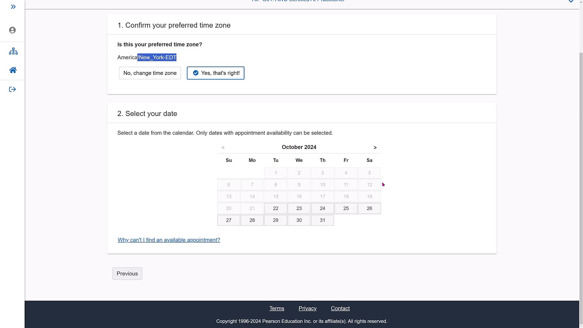 Next, confirm your preferred time zone (for example, New York EDT for East Coast residents) and choose an available exam date. The calendar will highlight available dates for you. If you prefer another month, simply navigate to that month on the calendar.