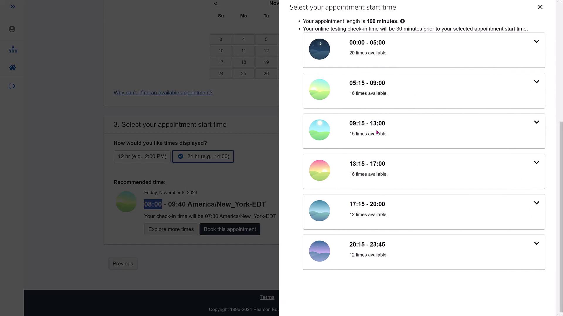 For instance, if November suits your schedule better, choose a date like November 8th (a Friday). The interface may indicate early check-in times (for example, an 8:00 a.m. exam might require check-in at 7:30 a.m.). Click “Explore More Times” to see additional time slots if needed.
