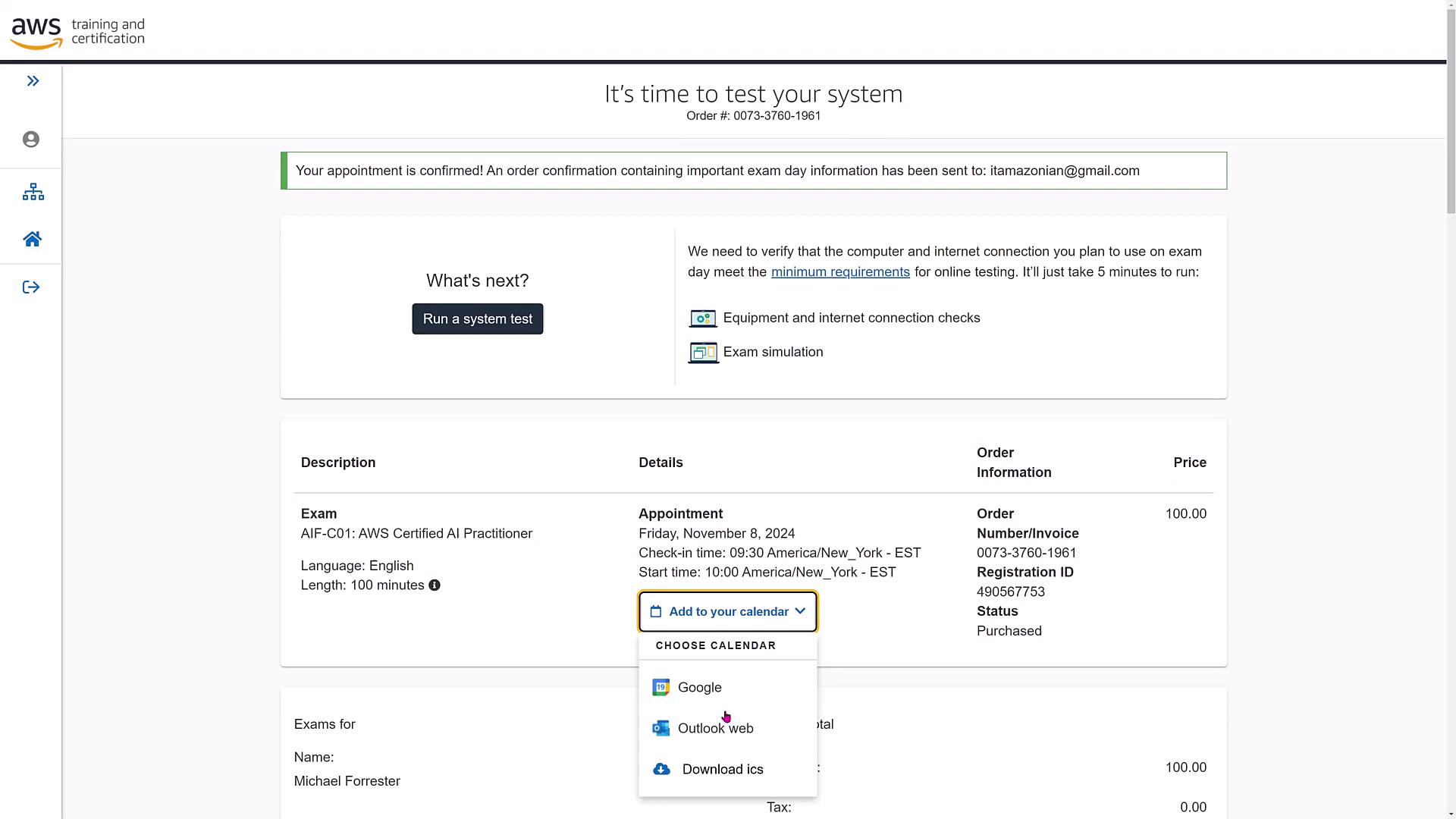 Upon submitting your payment, an order confirmation will be displayed. This confirmation outlines your exam appointment details and offers options to add the exam to your preferred calendar (Google Calendar, download, etc.).