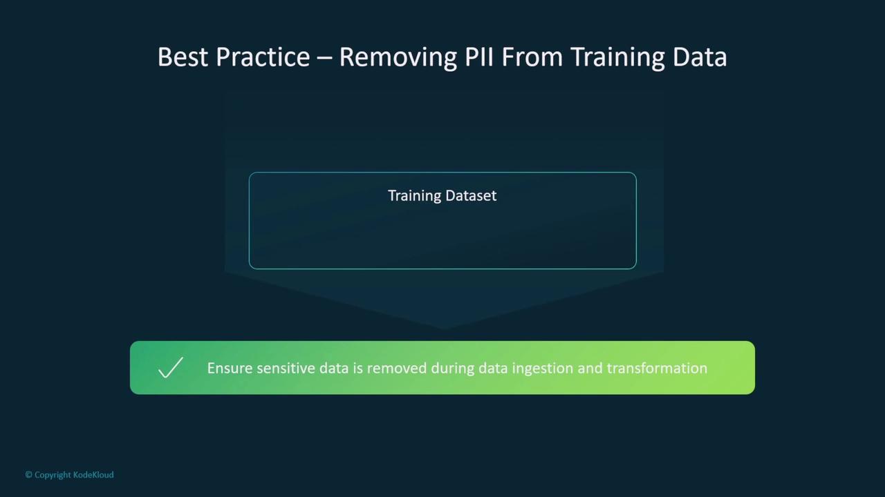 When preparing training datasets or performing feature engineering, remove any Personally Identifiable Information (PII) unless required. Secure data processing during ingestion and transformation minimizes the risk of exposing sensitive information.