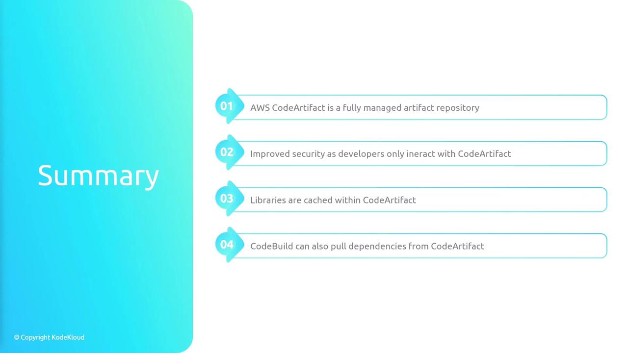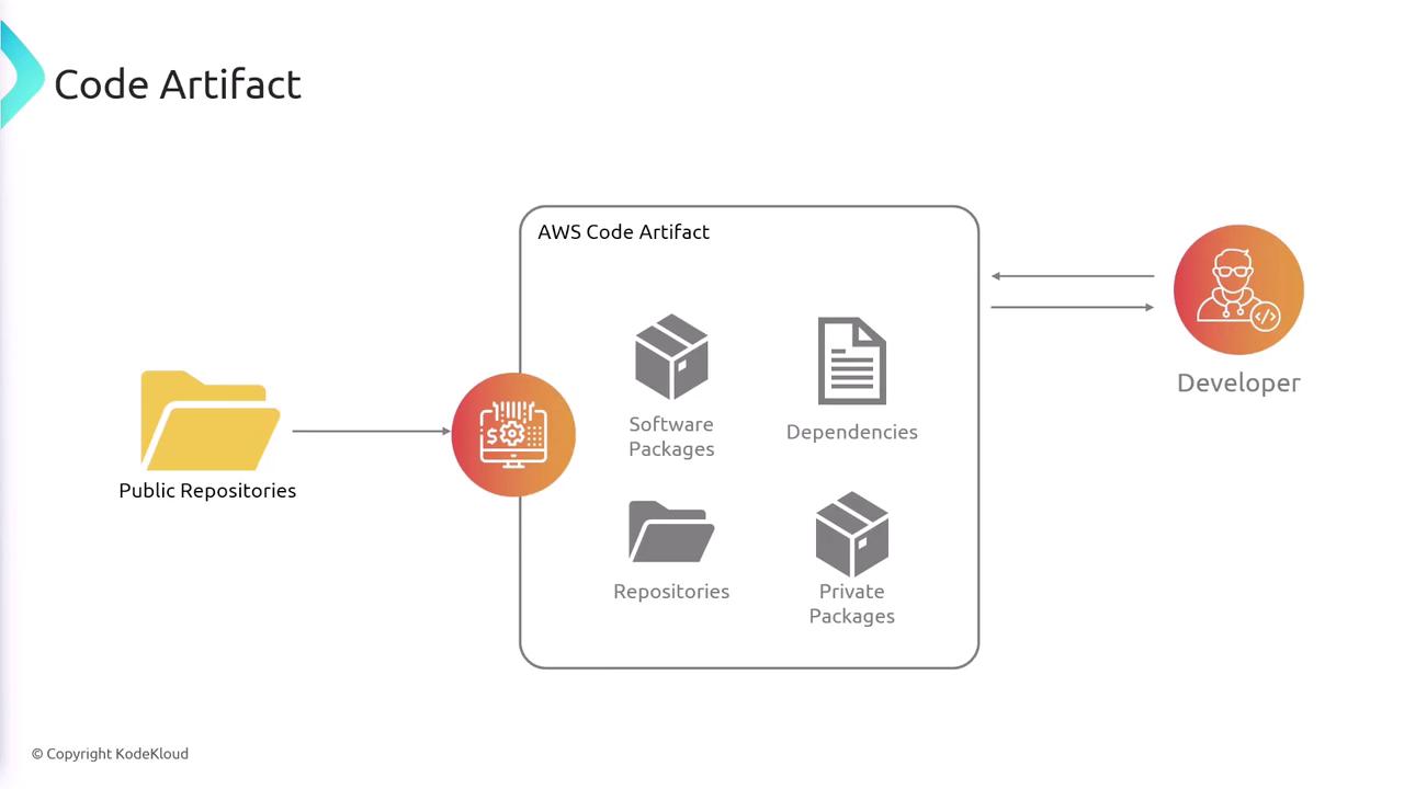 In this lesson, we explore AWS CodeArtifact, a fully managed artifact repository service designed to securely store, publish, and share software packages during application development. These packages—ranging from libraries and frameworks to various software components—are essential for building and maintaining your applications.