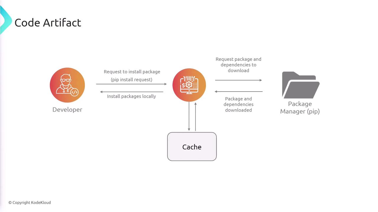 When a developer installs a package using a package manager, CodeArtifact intercepts the request to enhance performance and security. For example, to install the popular Python library "requests", a developer would use the following command: