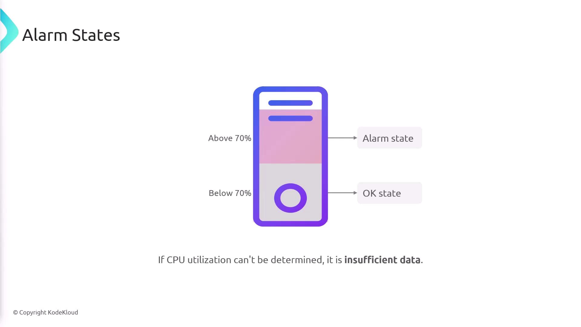 - Alarm: The metric exceeds the set threshold (e.g., CPU utilization is above 70%).