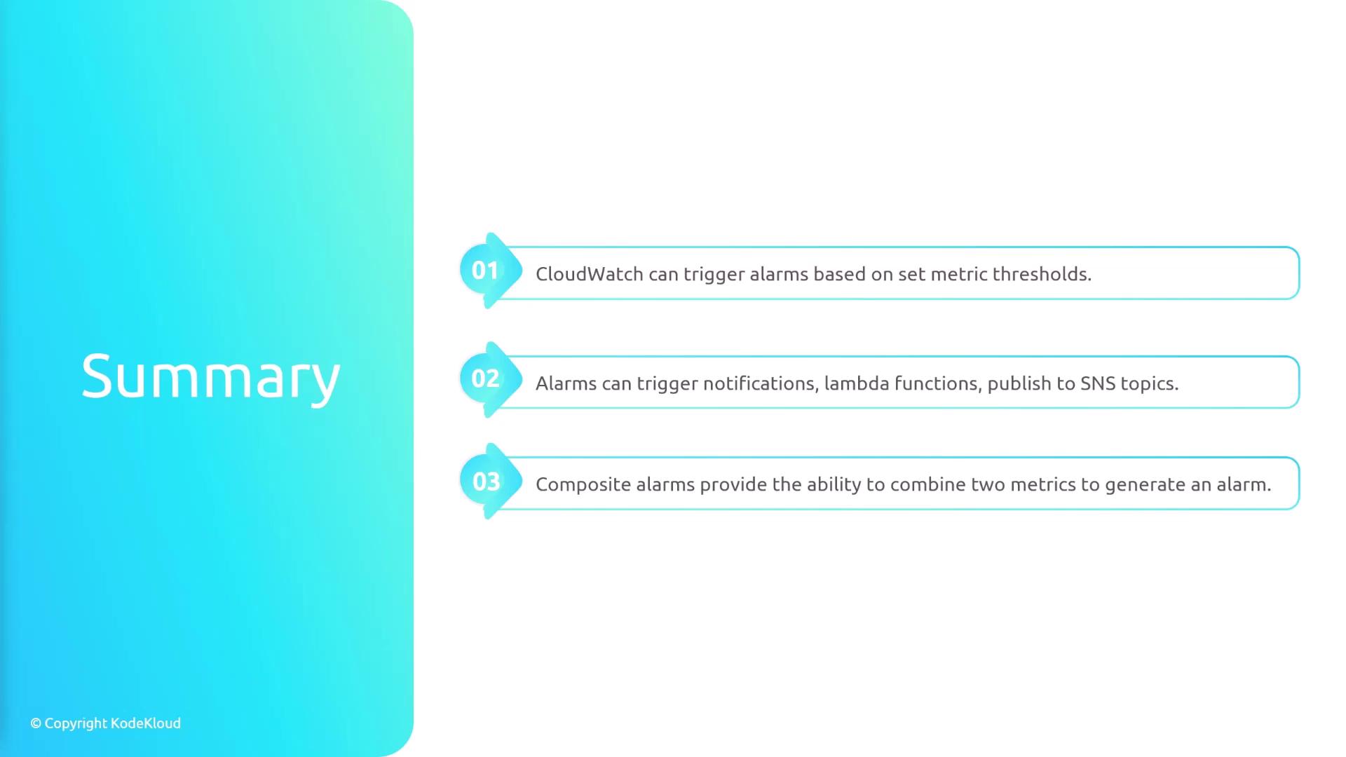 In this lesson, we explore CloudWatch alarms and how they enable automated monitoring of your AWS resources. With CloudWatch, you can set thresholds for various metrics so that an alarm is triggered when a specified value is reached. For example, you can configure an alarm for an EC2 instance to trigger if the CPU utilization exceeds 70%. When activated, the alarm can perform a series of actions such as sending notifications, invoking a Lambda function, or publishing to an SNS topic.