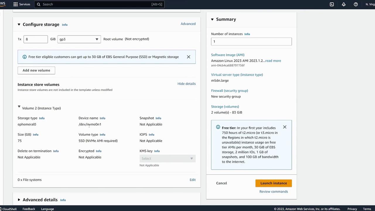 Proceed with the launch. In the storage configuration details, both the root volume and the instance store volume will be clearly indicated.