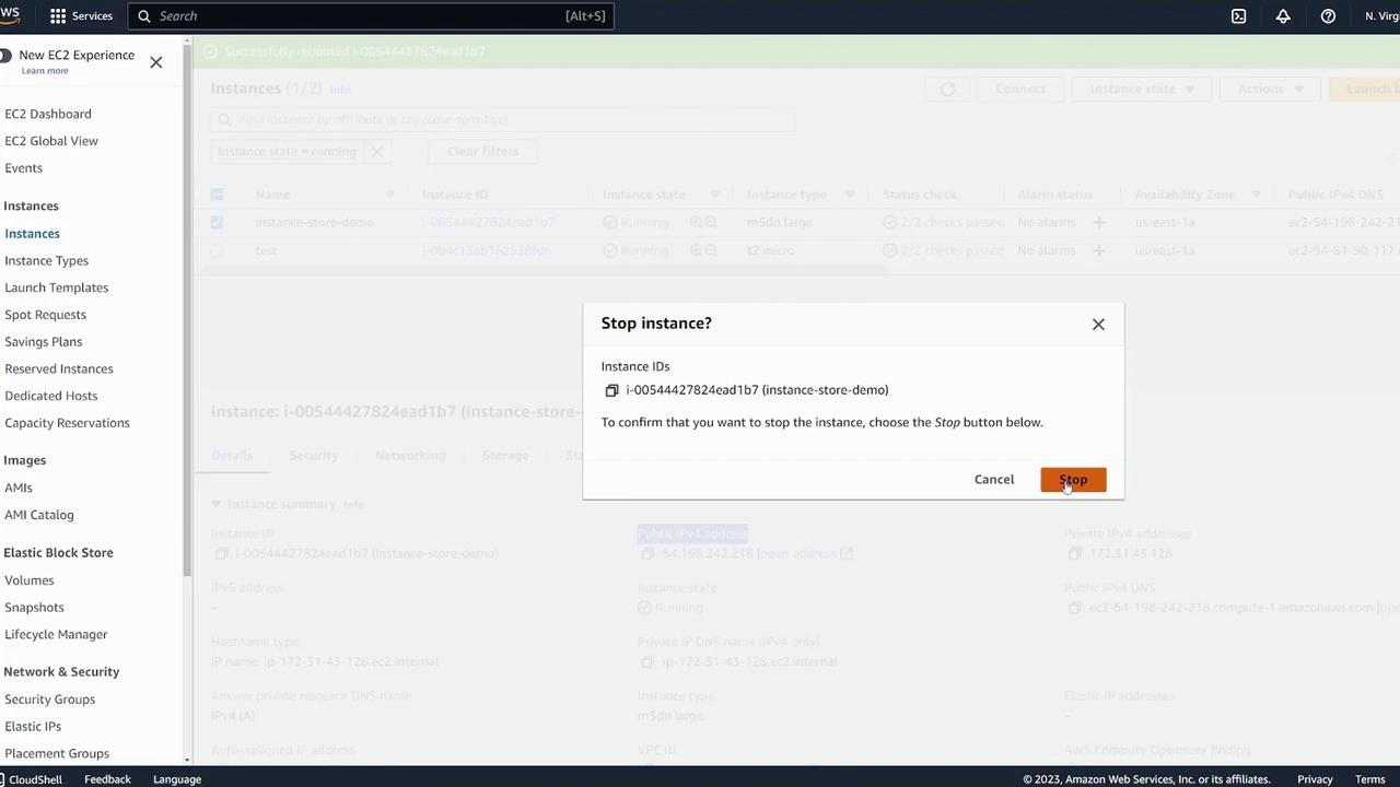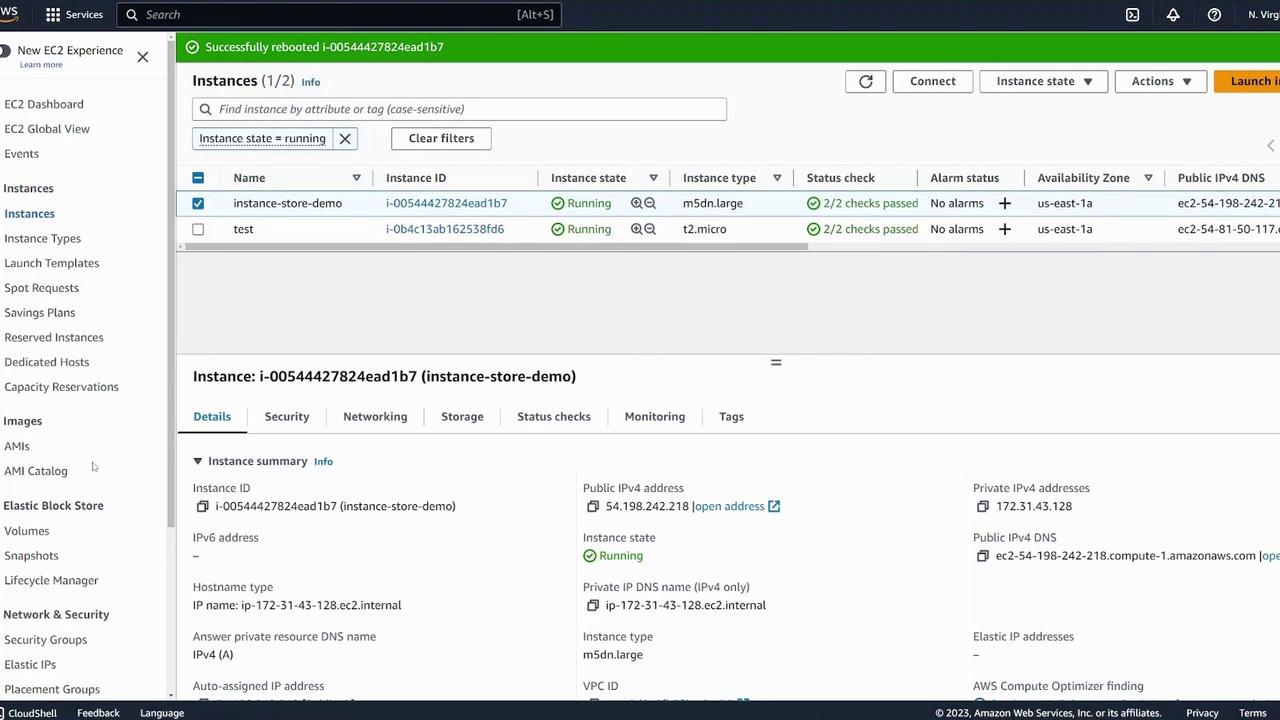 Note that the file test may be missing if the volume was remounted after a stop/start (i.e., when the instance moved). This confirms that instance store data does not persist across host changes.