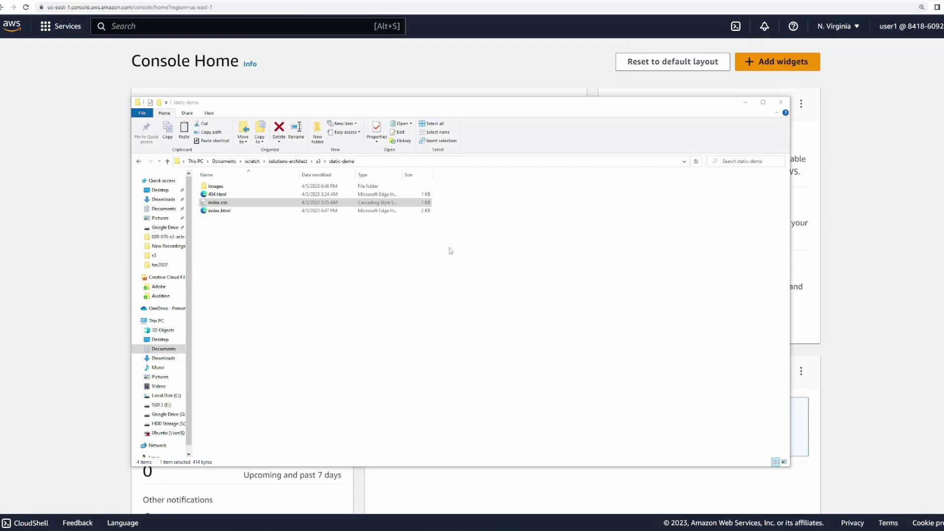 Below is an image illustrating the AWS Console Home page alongside a Windows File Explorer window that displays the "static-demo" folder with HTML and CSS files.
