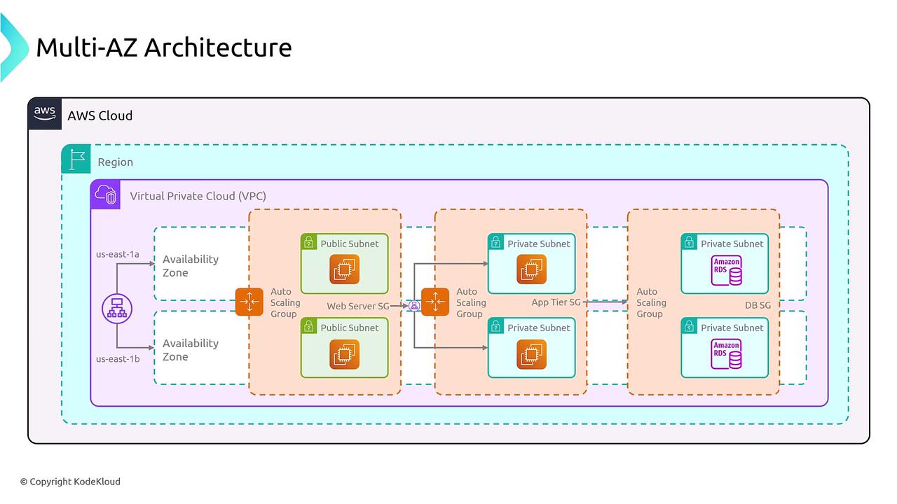 The diagram below compares single-AZ and multi-AZ configurations. It details how components such as subnets, databases, auto scaling groups, Elastic Load Balancers, and security groups work together to enhance reliability and security.