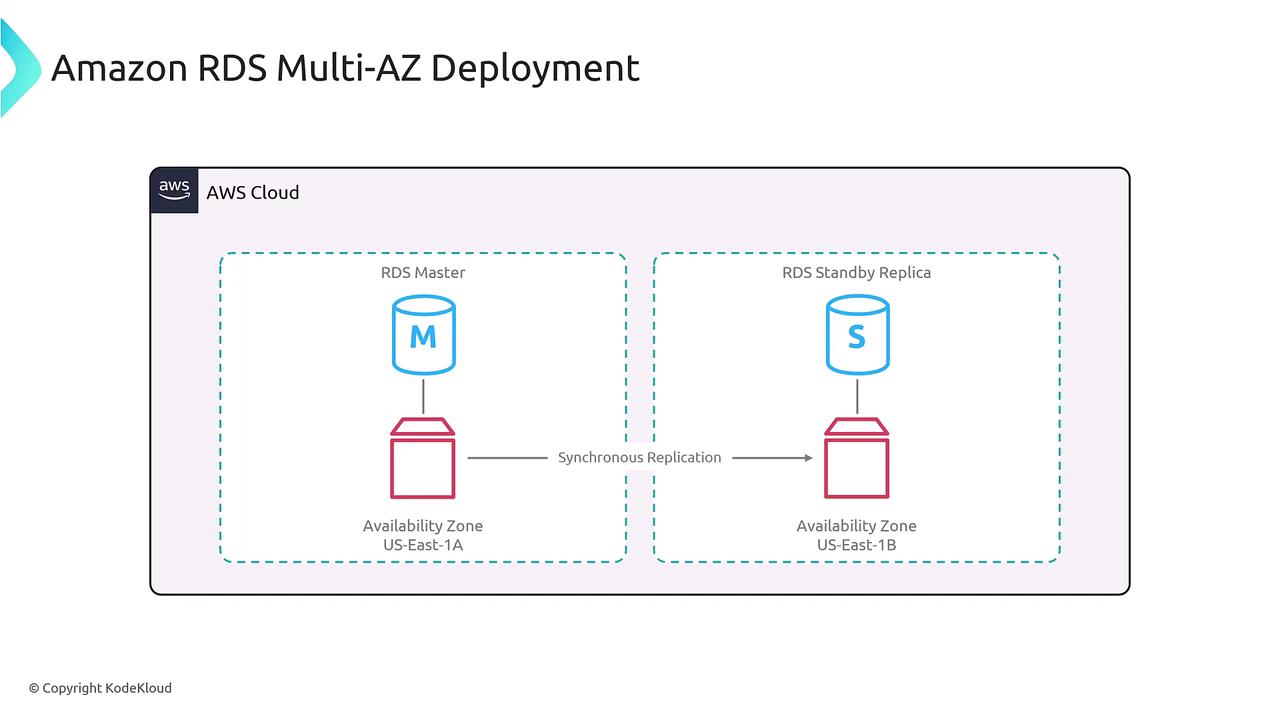 Amazon RDS is a prime example of multi-AZ deployment. By simply enabling the Multi-AZ option in the configuration, RDS creates a primary-secondary (active-passive) environment. In this setup, synchronous replication ensures that a write operation on the primary is simultaneously applied to the standby replica before confirmation is returned to the client.