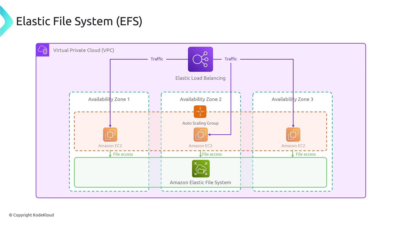 | Elastic File System (EFS) | Region-wide shared storage redundancy | Use with load balancers for optimal file accessibility |