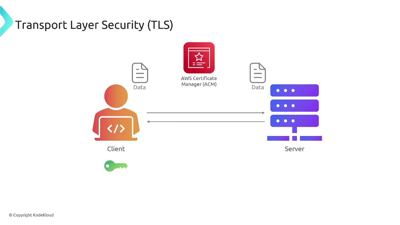 Encryption in transit mainly relies on Transport Layer Security (TLS), the advanced and more secure evolution of SSL. To ensure robust security, it is recommended to use TLS 1.2 or higher when establishing connections between clients and endpoints. AWS Certificate Manager is instrumental in obtaining and managing the third-party certificates needed for these secure communications.