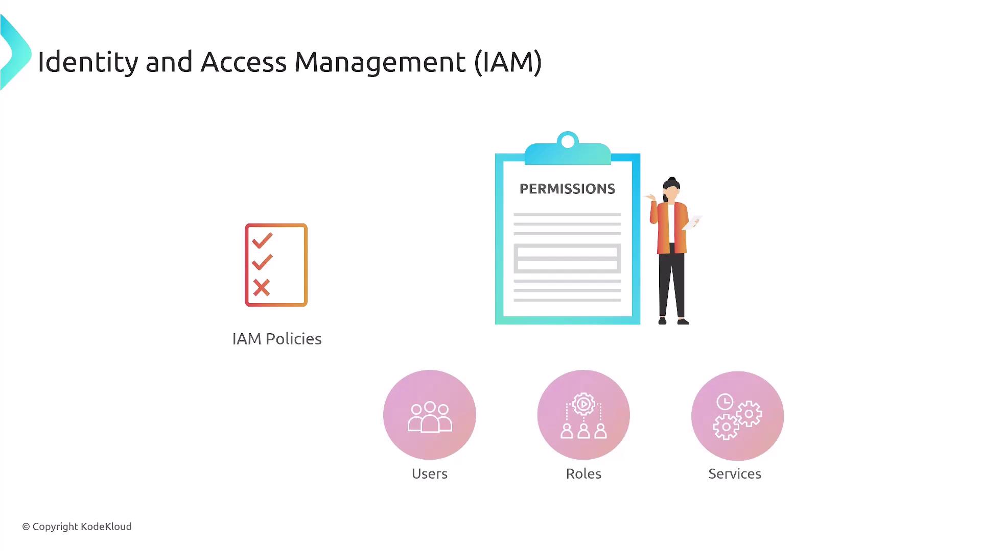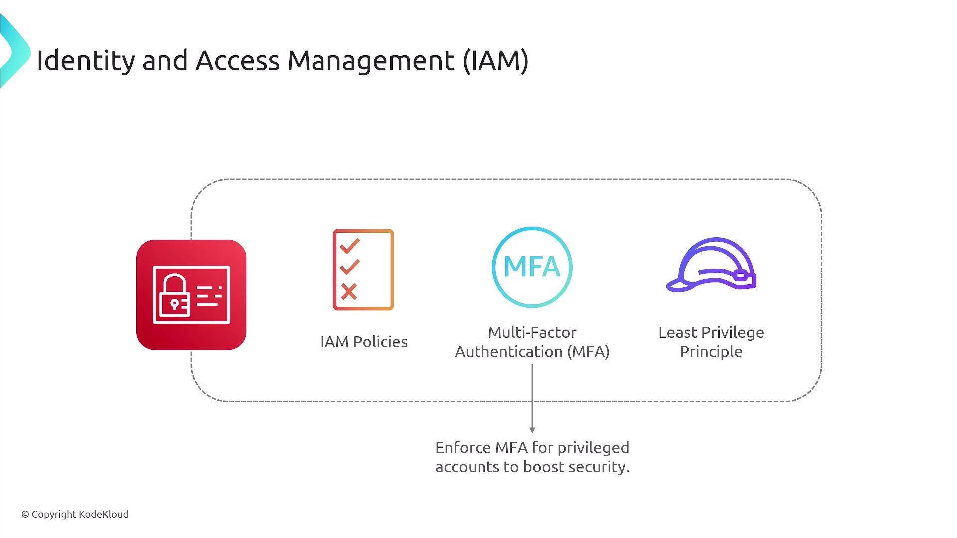 IAM policies protect users, groups, roles, and AWS services, while additional measures like Multi-Factor Authentication (MFA) and the principle of least privilege further strengthen security.