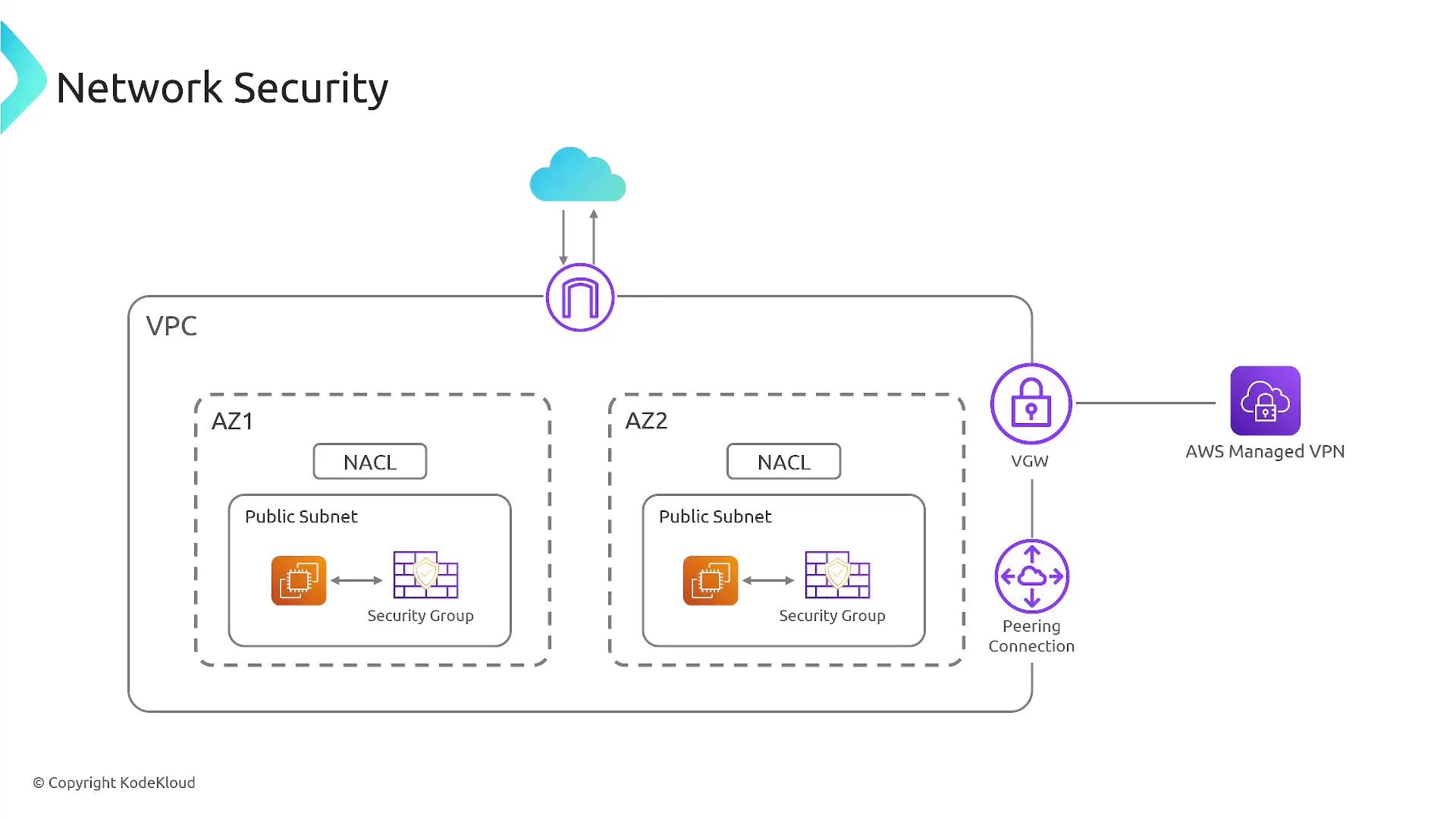 - Network Access Control Lists (NACLs): Provide stateless, subnet-level security.