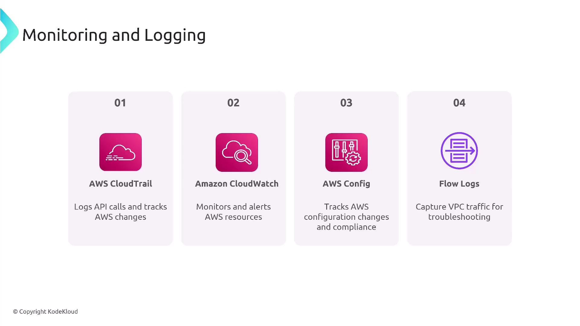 Effective monitoring and logging are crucial for identifying and addressing security issues. AWS offers a suite of tools for comprehensive oversight: