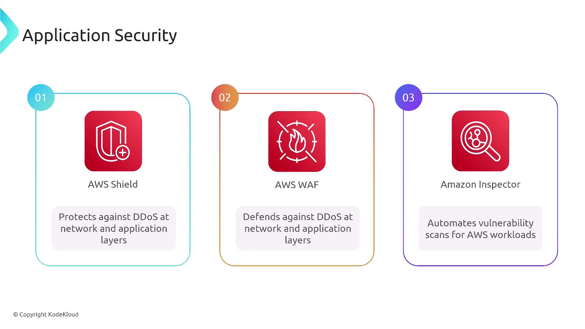 - Inspector: Automates vulnerability assessments for applications, Lambda functions, containers, and virtual machines.