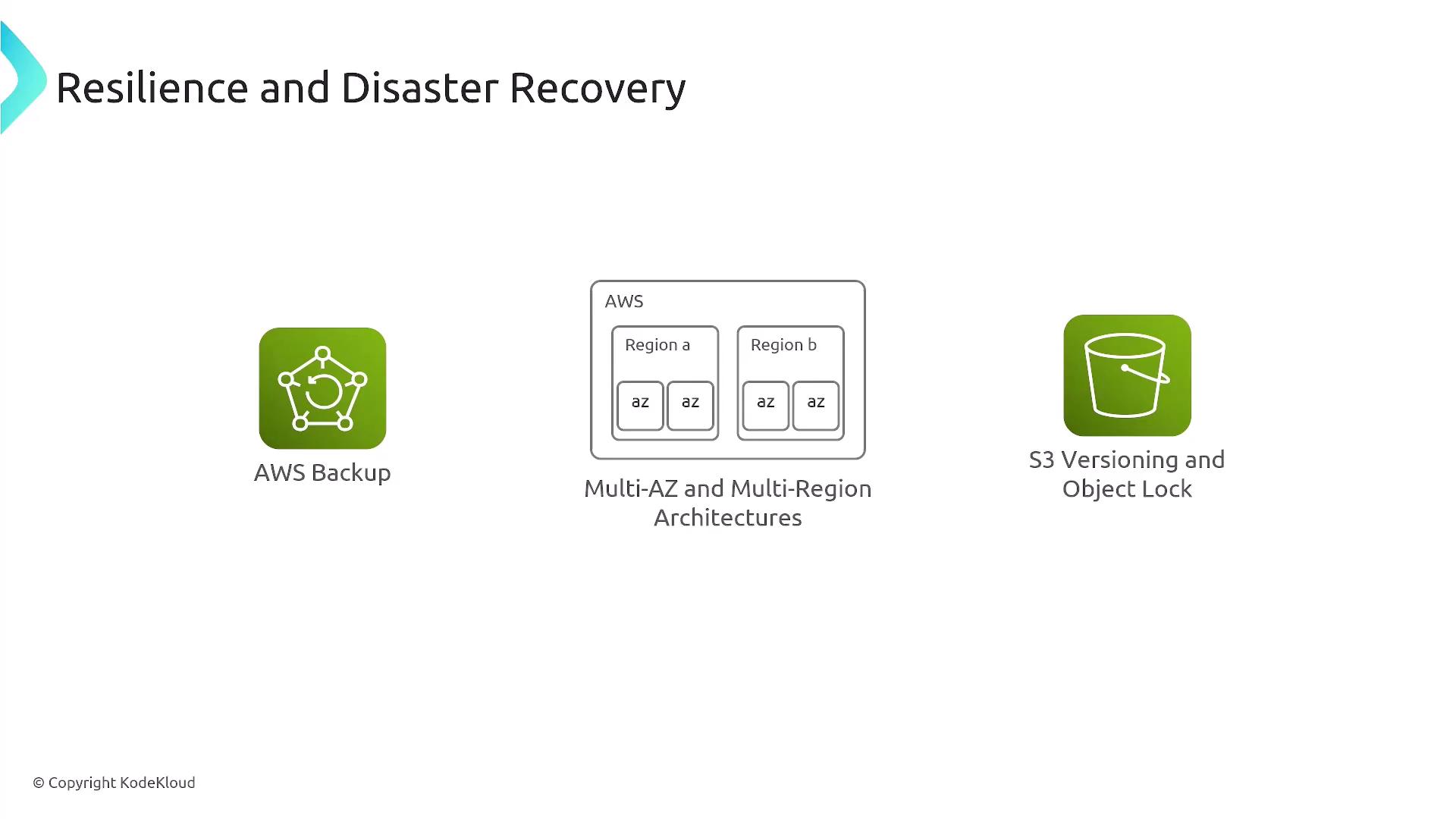 - S3 Versioning and Governance Locks: Offer an extra layer of protection by preserving historical data and preventing accidental deletions.