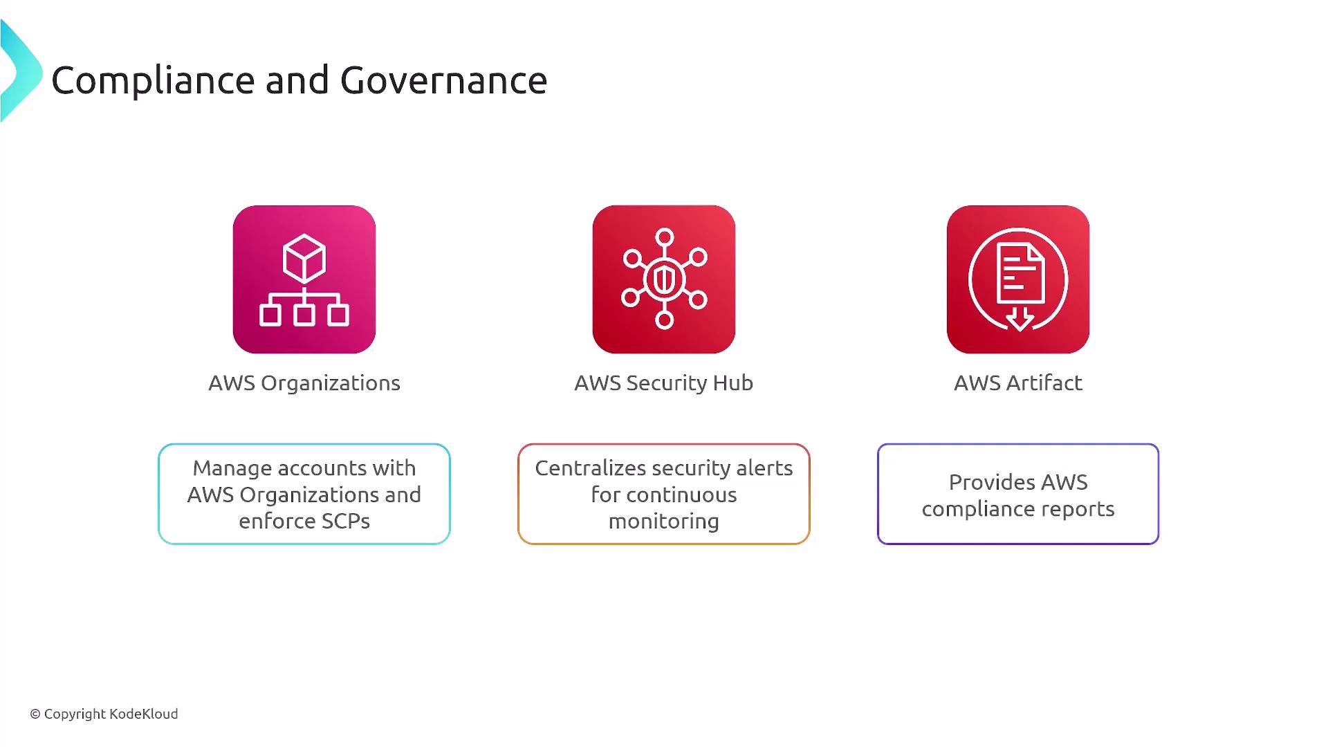 Moreover, AWS Organizations, AWS Security Hub, and AWS Artifact facilitate compliance and governance throughout your cloud environment.