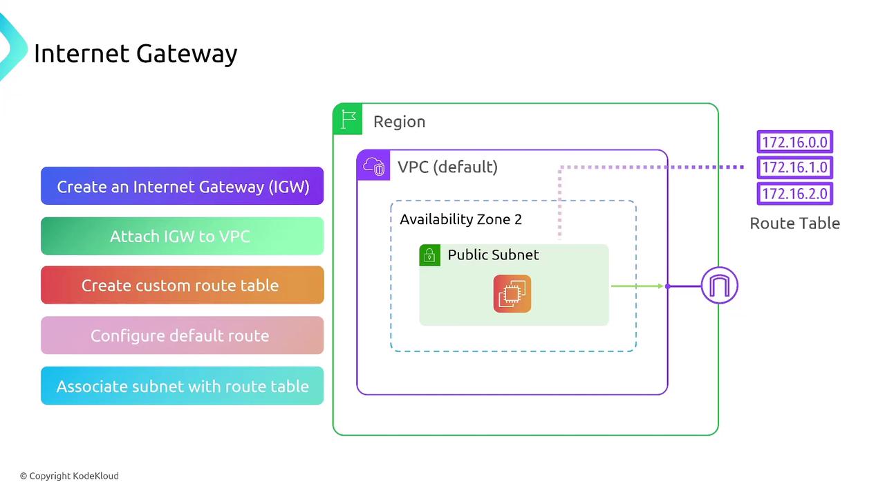 For example, in a private subnet without an Internet Gateway route, the resource remains inaccessible from the internet. The standard steps to configure an Internet Gateway are: