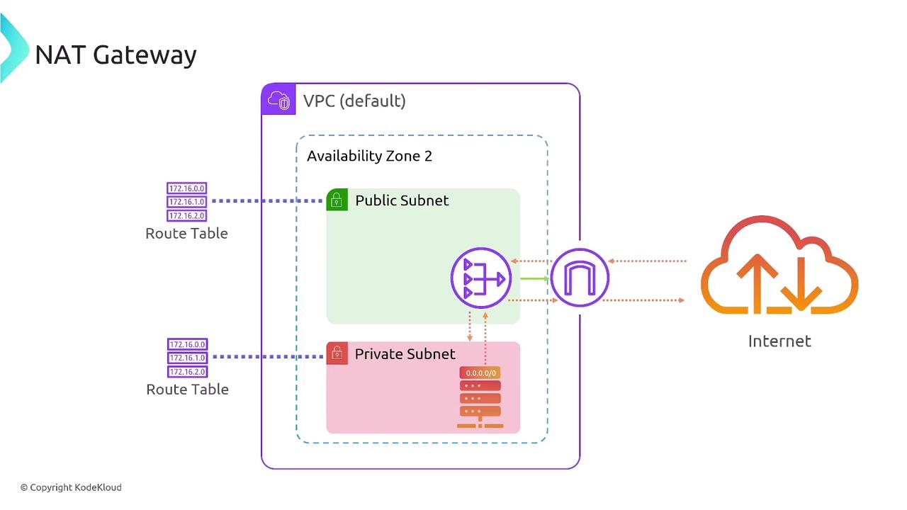 - The NAT Gateway resides in a public subnet with its own route to the Internet Gateway.