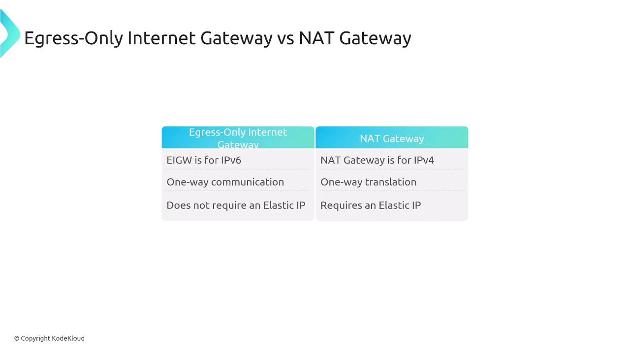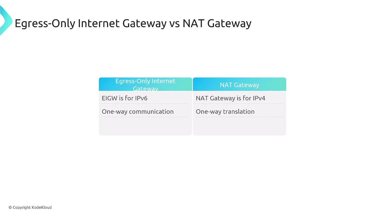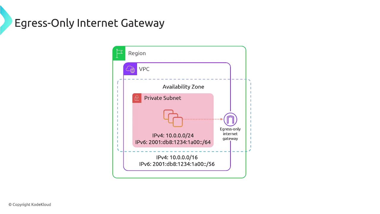 - Egress-only Internet Gateways offer a direct, unaltered IPv6 connection for outbound traffic without translation.