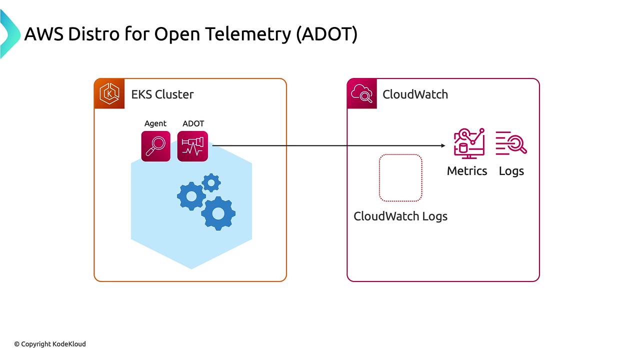 The AWS Distro for OpenTelemetry (ADOT) add-on extends CloudWatch Logs agent capabilities by collecting metrics, logs, and distributed traces. You can send data to CloudWatch or any OpenTelemetry-compatible backend.