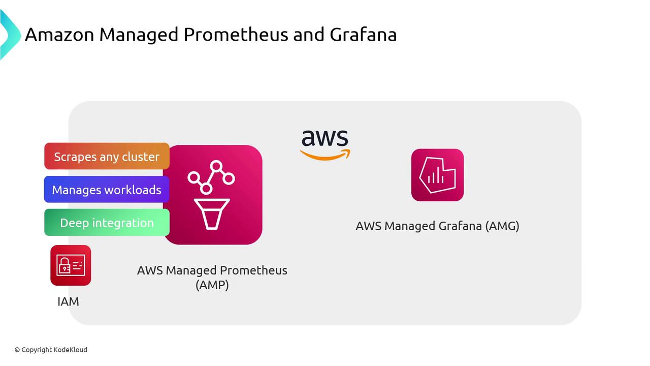 | Amazon Managed Prometheus | Scalable metrics ingestion & storage | Auto scale, high availability, Prometheus-compatible |