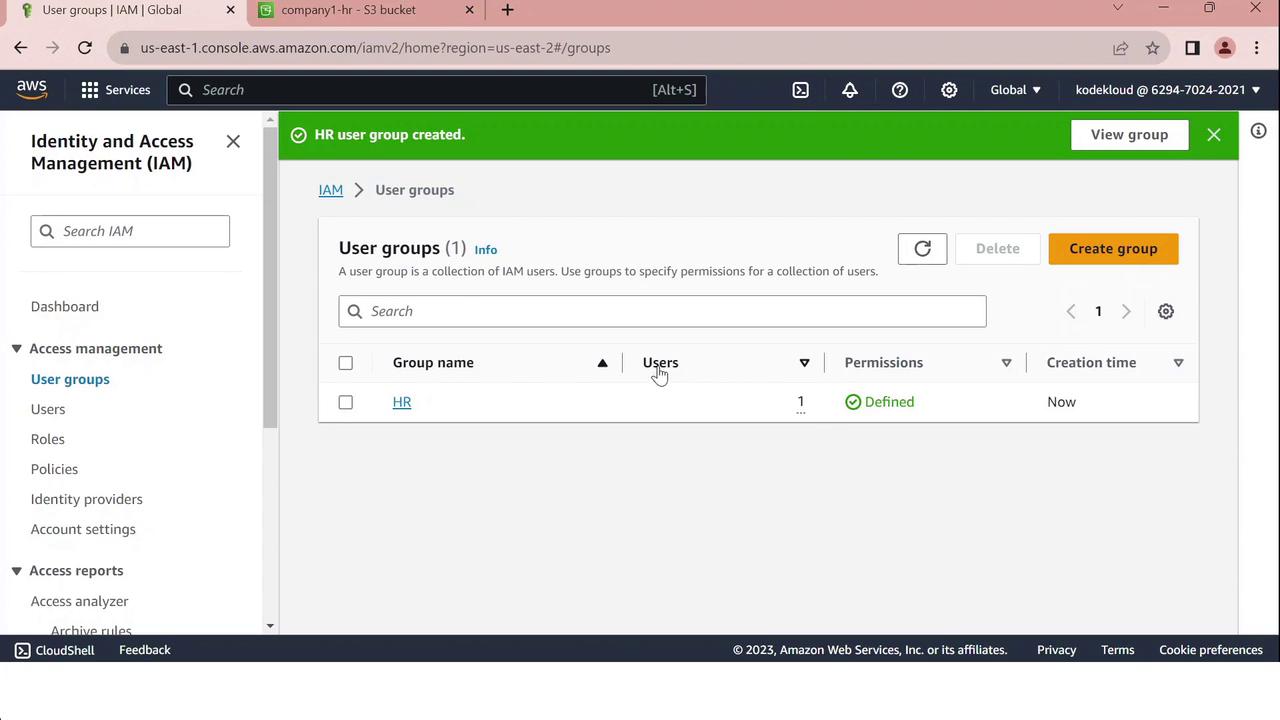{ "Version": "2012-10-17", "Statement": [ { "Sid": "HRPolicy", "Effect": "Allow", "Action": "s3:*", "Resource": [ "arn:aws:s3:::company1-hr-bucket", "arn:aws:s3:::company1-hr-bucket/*" ] } ] }Review the policy, give it a name like