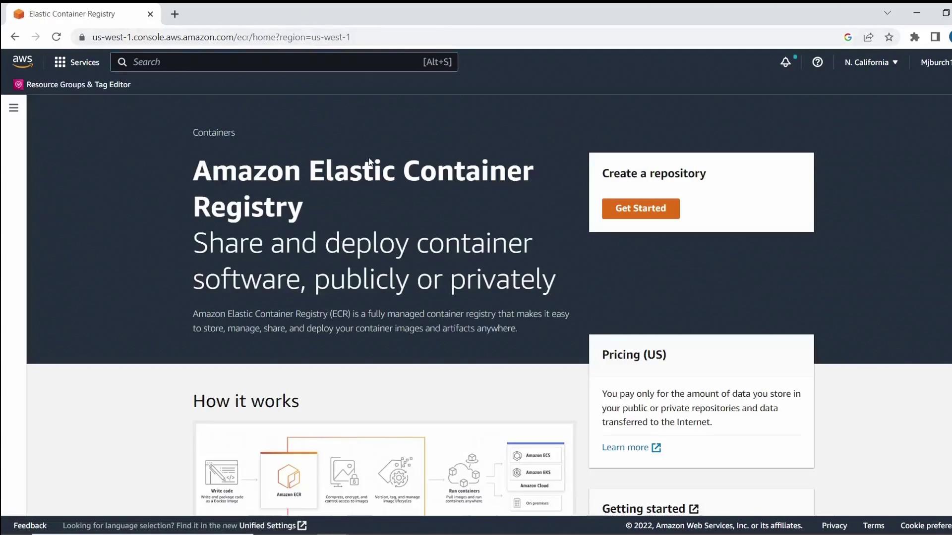 The AWS Elastic Container Registry (ECR) hosts your container images. In the AWS Management Console, navigate to Elastic Container Registry.