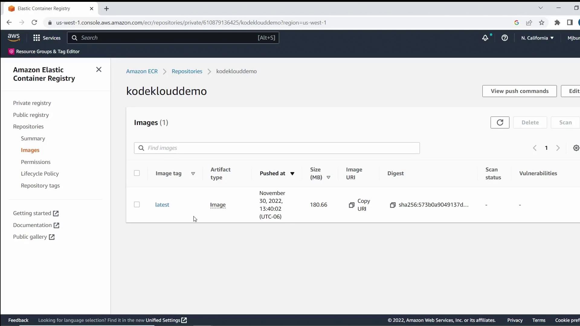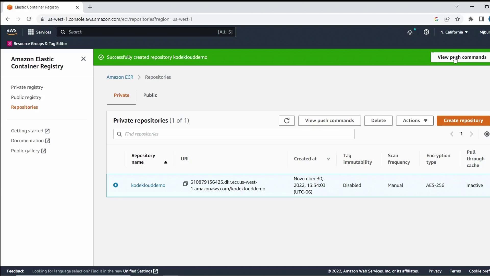 docker tag kodeklouddemo:latest \ <account-id>.dkr.ecr.<region>.amazonaws.com/kodeklouddemo:latestPush the image to ECR: