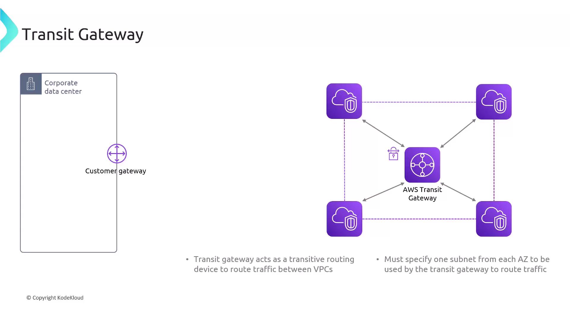 When you attach a VPC to a Transit Gateway, you specify one subnet in each Availability Zone: