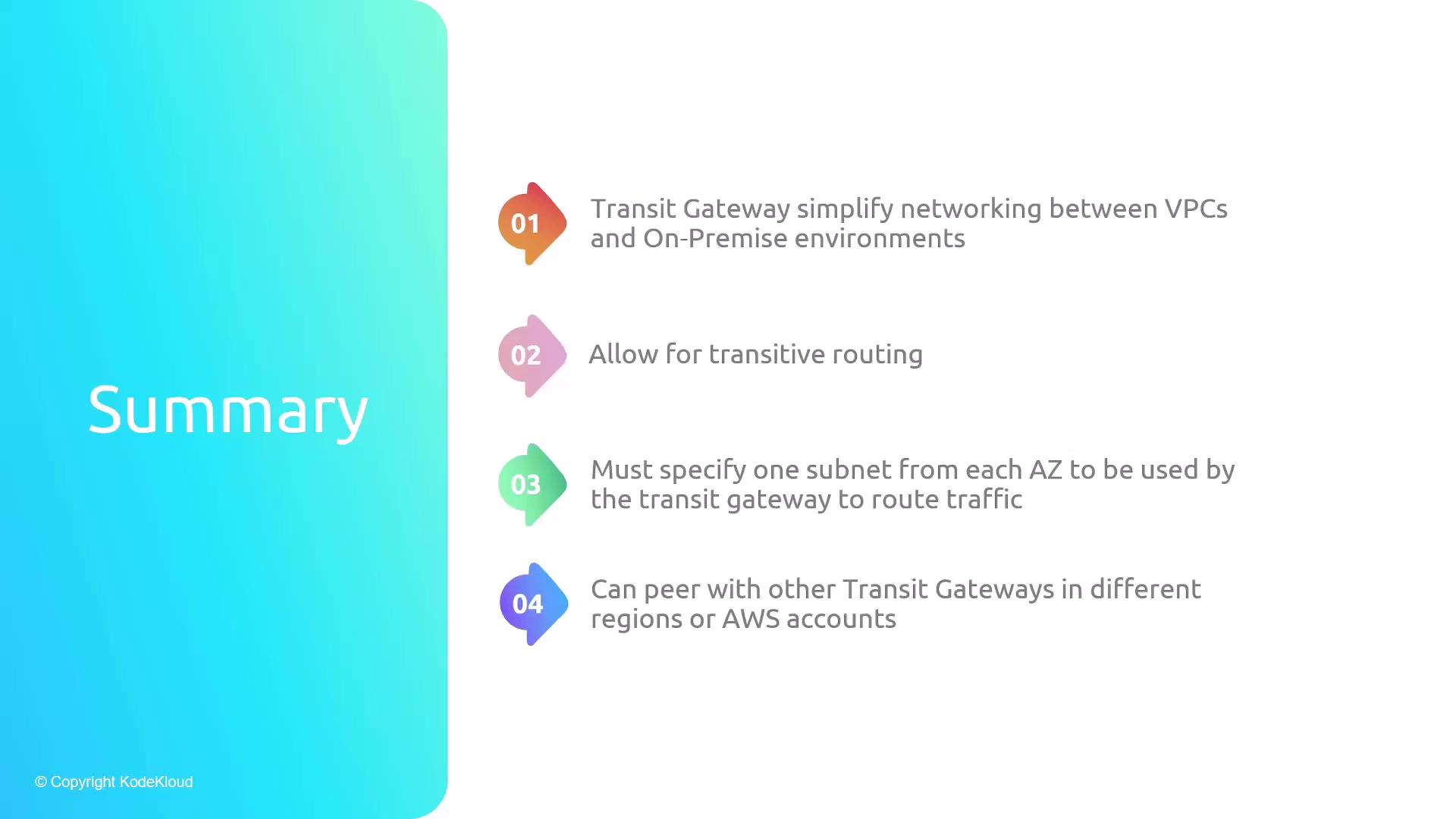 By adopting AWS Transit Gateway, you streamline your network architecture, enable scalable transitive routing, and centralize connectivity for both cloud and on-premises environments.