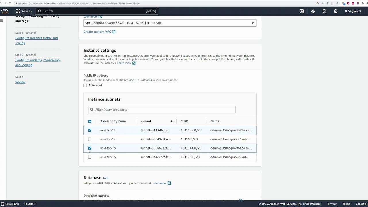 Optionally, you can enable an associated database, though this demo leaves that option disabled. Additional tags can be added if required, and default settings for attached storage volumes are retained.