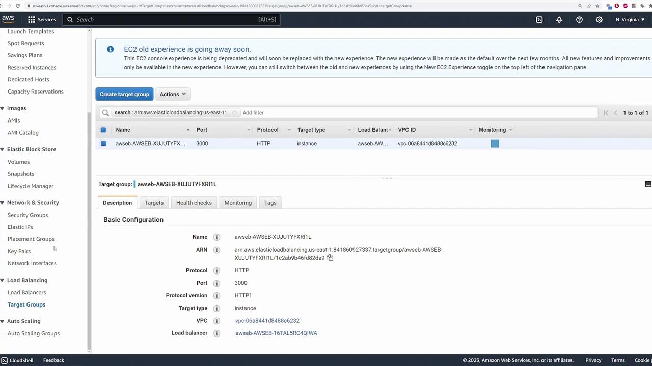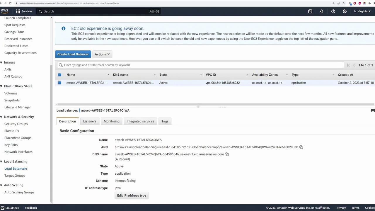 - The load balancer and its forwarding rules, along with target groups, are also visible in the console.