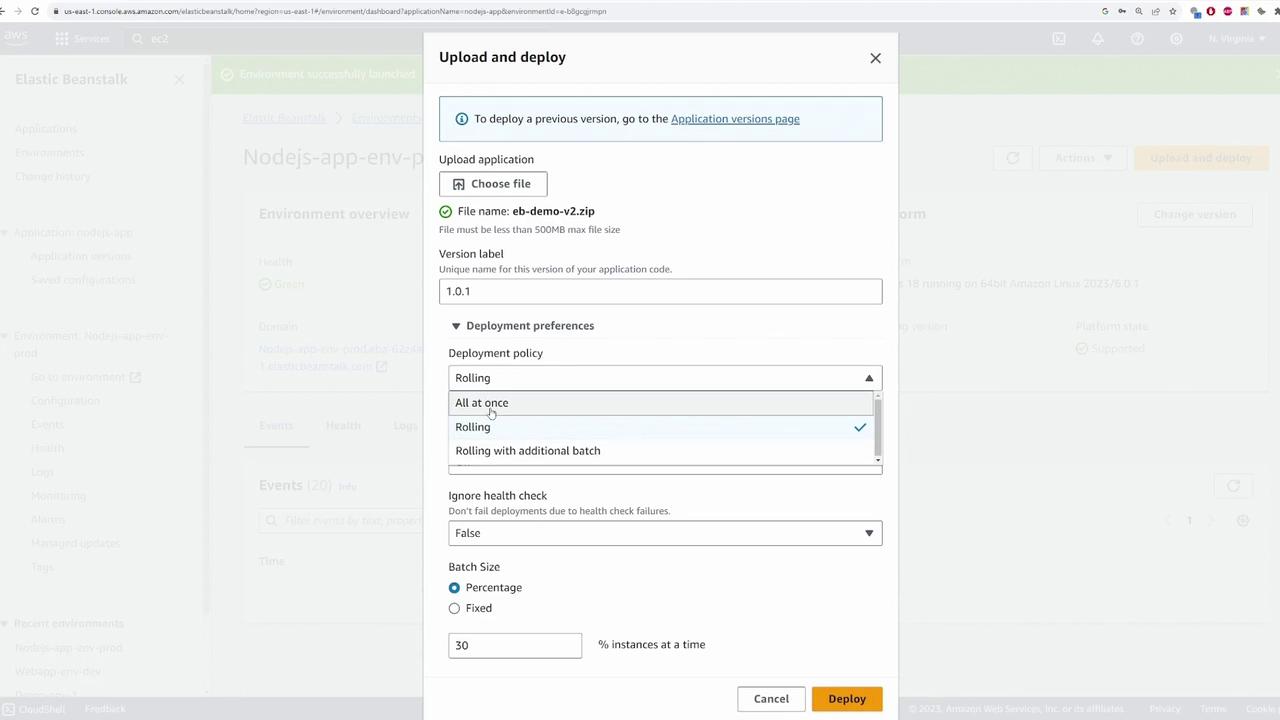 After confirming the changes locally, create a new ZIP archive (e.g., "EB demo-v2.zip") that includes all updated source files. Upload this new package, assign it the version label "1.0.1," and choose your deployment policy. The default rolling update method minimizes downtime by gradually updating instances.