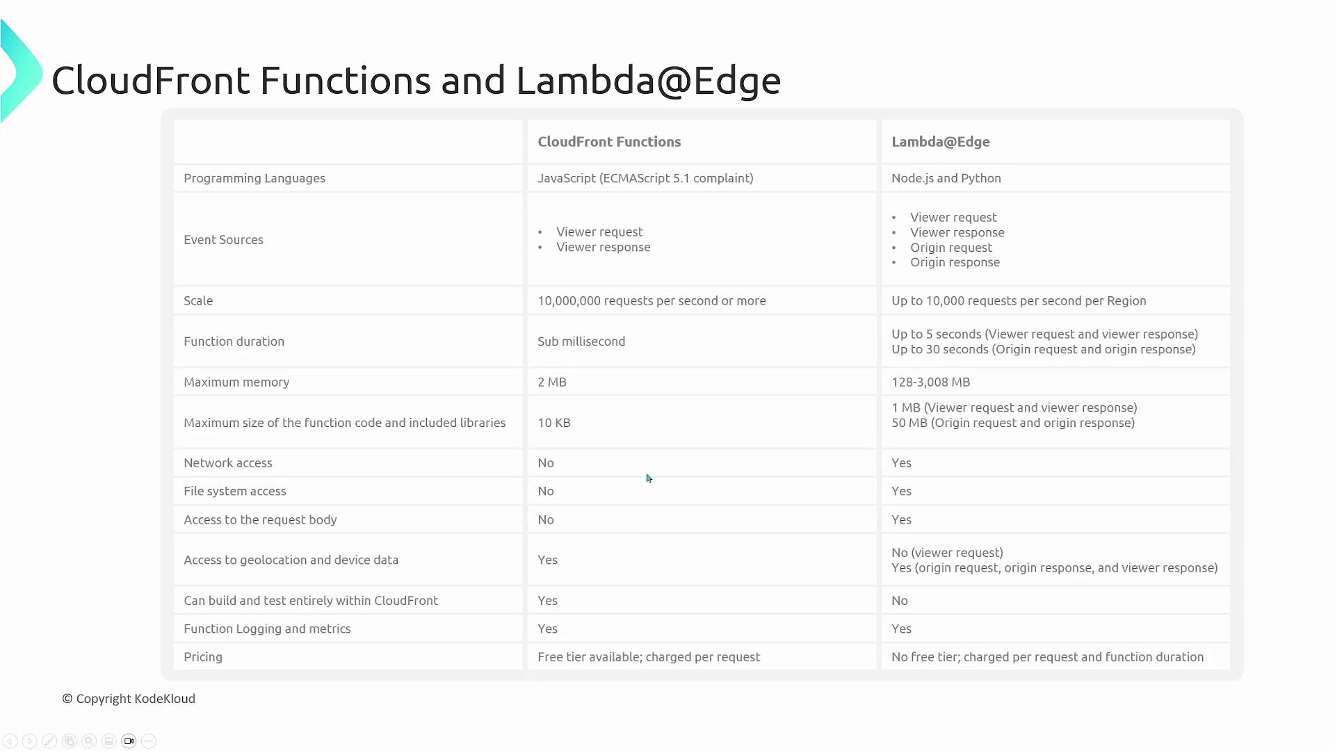 A detailed comparison chart below outlines the differences between CloudFront functions and Lambda@Edge. This chart covers programming languages, event triggers, scaling, function duration, and capabilities like network and file system access.