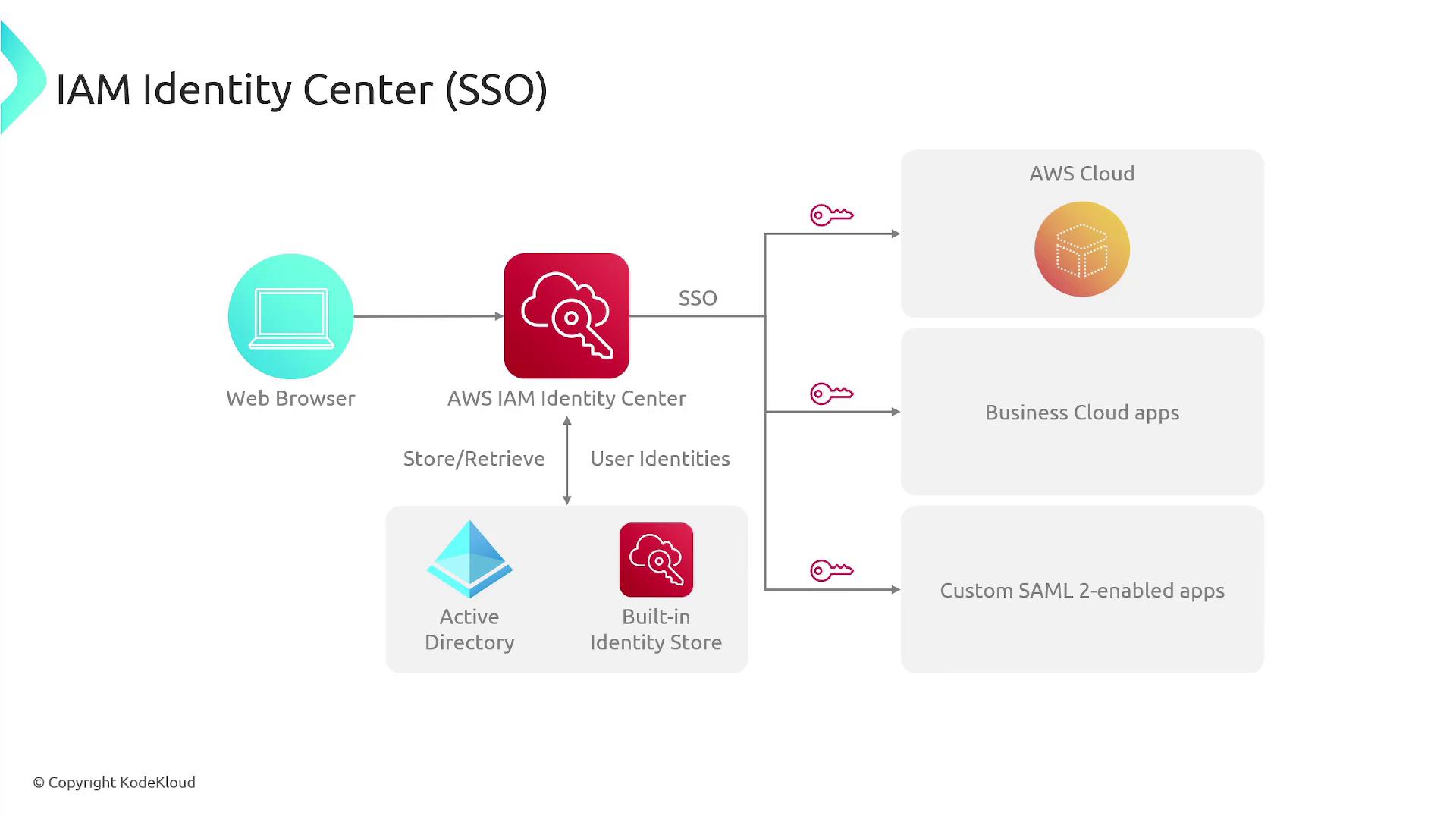 When a user initiates an action in AWS, IAM Identity Center handles both authentication and authorization. Unlike traditional IAM—where users are created and managed individually in each account—IAM Identity Center allows for integration with well-known cloud identity providers such as Active Directory, OneLogin, Okta, and Microsoft Active Directory. This integration facilitates Single Sign-On (SSO) access to AWS resources and various applications.