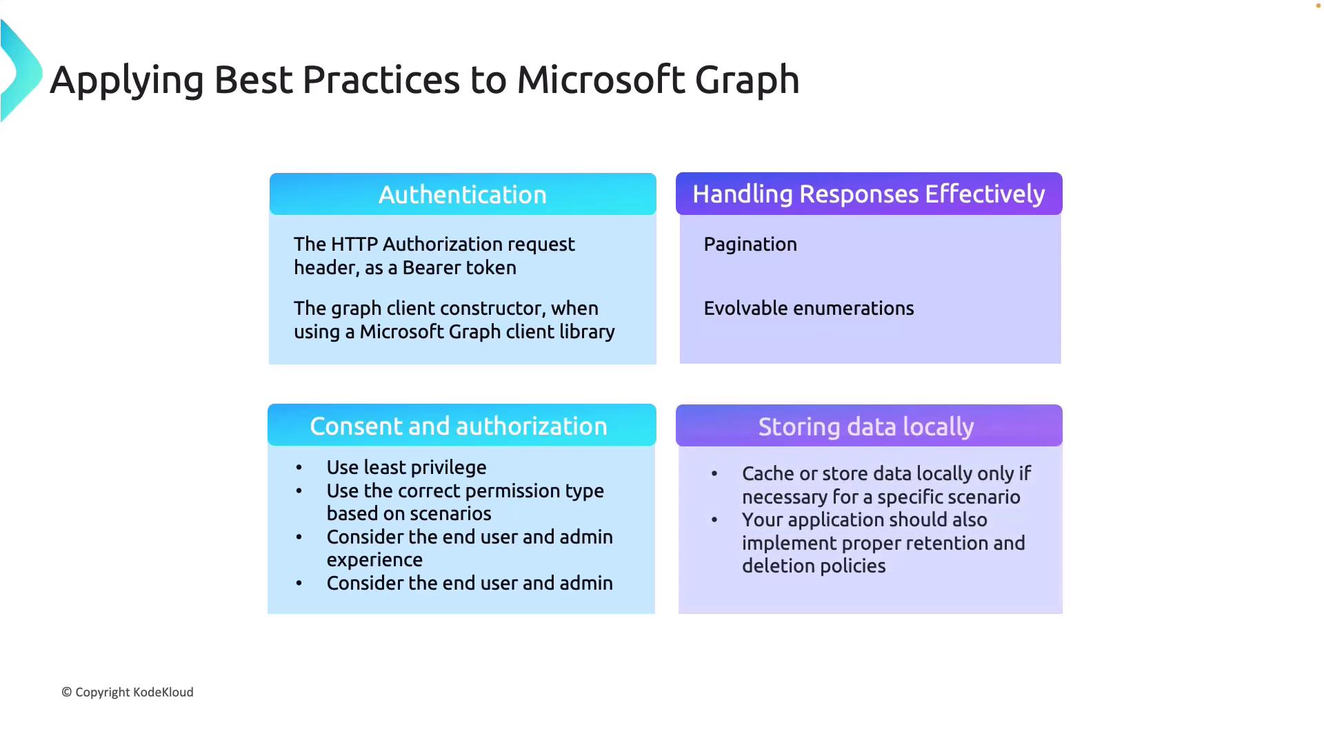 Adopting these practices and tools will enhance your interaction with Microsoft Graph, ensuring your application remains secure, performant, and adaptable to future changes. This concludes our module on Microsoft Graph best practices.