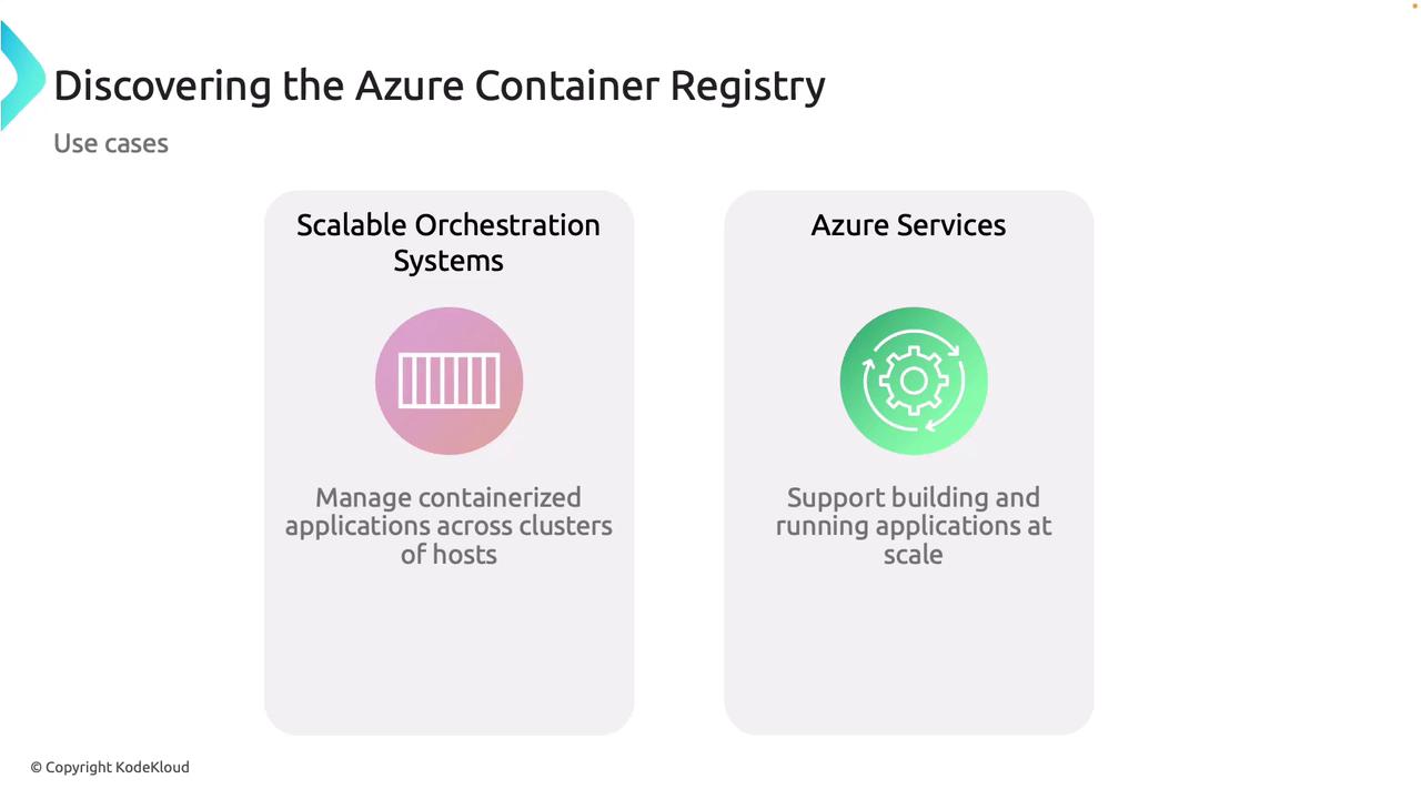 These use cases illustrate the flexibility and strength of Azure Container Registry for a wide range of deployment scenarios—from managing container orchestration systems to integrating with broader Azure services.