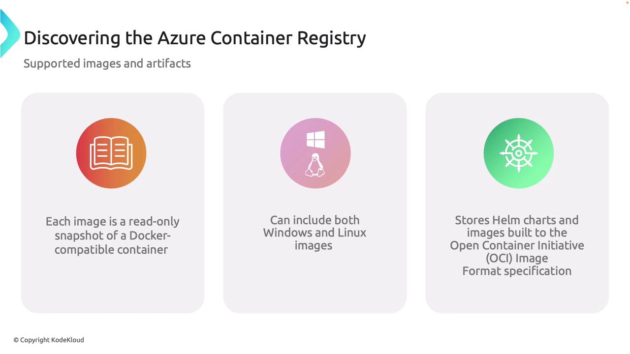 In this lesson, you'll learn about ACR's key use cases, service tiers, supported artifact types, and robust storage capabilities.