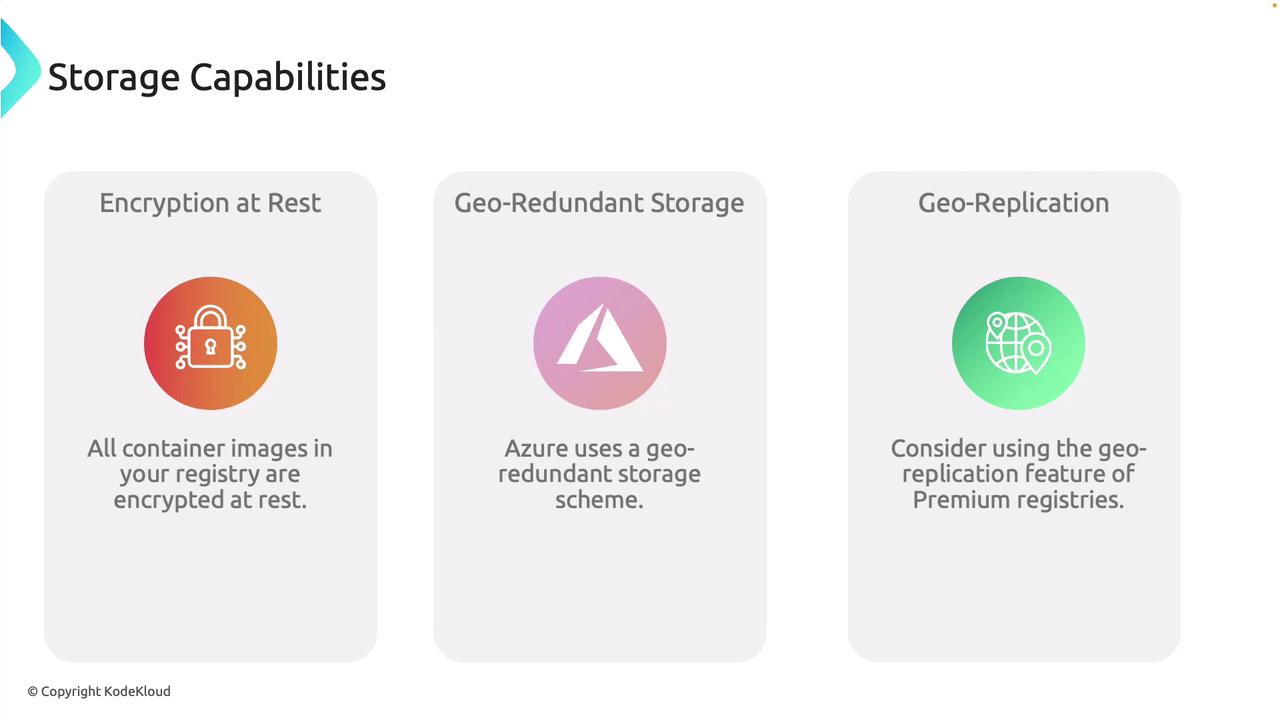 - Geo-Redundant Storage: Container images are replicated across multiple regions using Azure's geo-redundant storage, enhancing availability and ensuring reliability during regional outages.