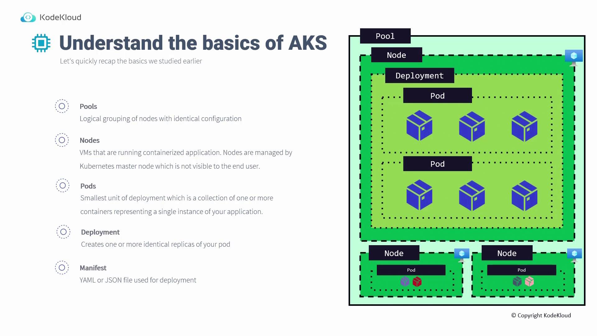 Within each pool, nodes (which are virtual machines) host your containerized applications. In AKS, these nodes are managed by the Kubernetes master node, which is abstracted from the end user since AKS is a managed cluster. This allows Microsoft to handle master node management seamlessly.