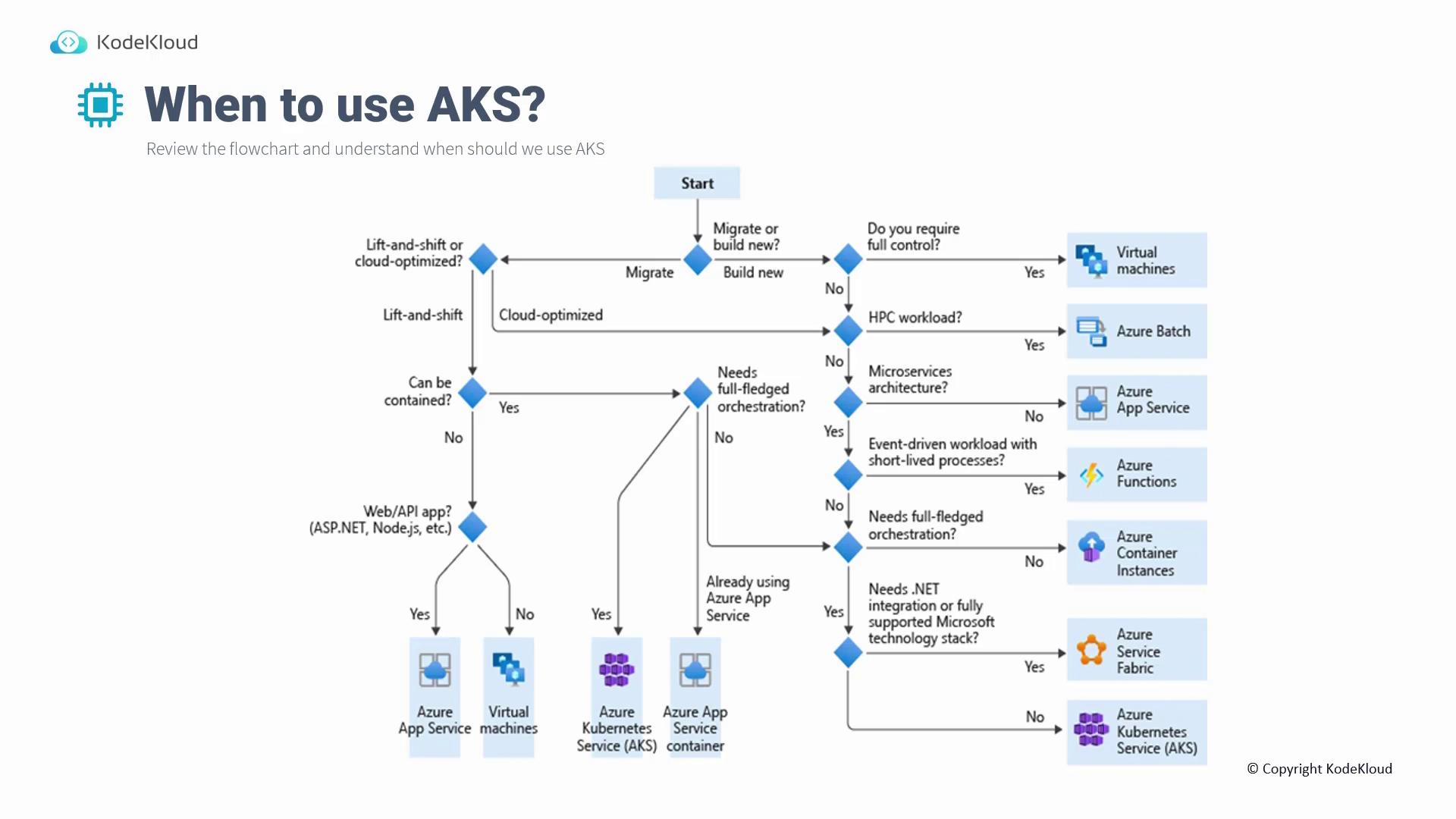 Determining whether AKS is the right choice for your application is essential. The decision flowchart below illustrates scenarios where containerized applications—whether for lift-and-shift, migration, or enhanced cloud optimization—would benefit from full-fledged orchestration using AKS.